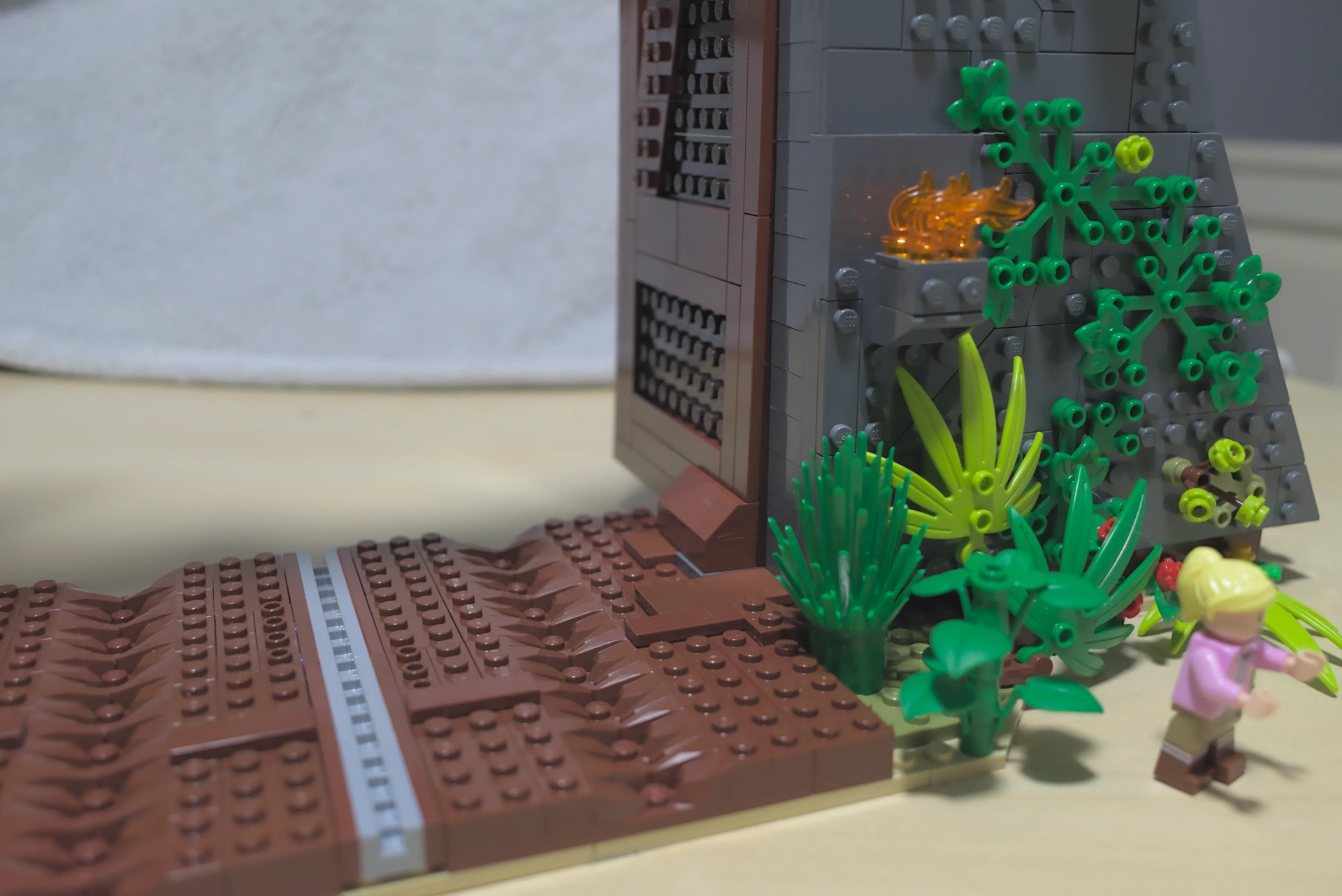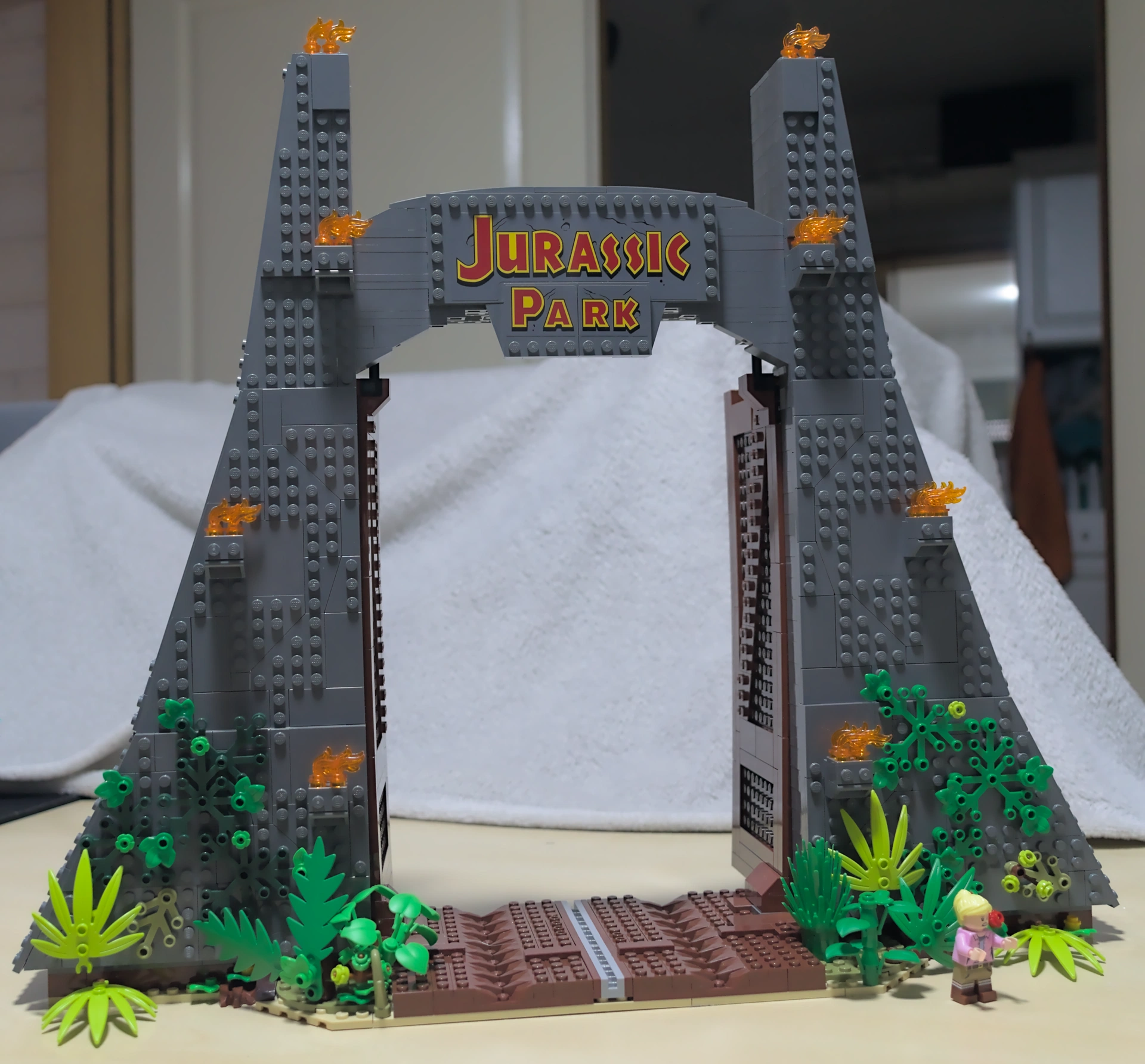Élément iconique de Jurassic Park et de Jurassic World , le portail se devait d’être convainquant. Et, bonne nouvelle, il l’est ! Tout aussi démesuré que le T. rex, sa taille est calculée pour y faire passer le monstre. À l’heure actuelle, c’est clairement mon LEGO® le plus grand et le plus haut. Il est également très détaillé : empreintes de roues, végétation luxuriante digne des décors hawaiiens où ont été tournés les différents films, torches, logo, tout y est, et plus encore.