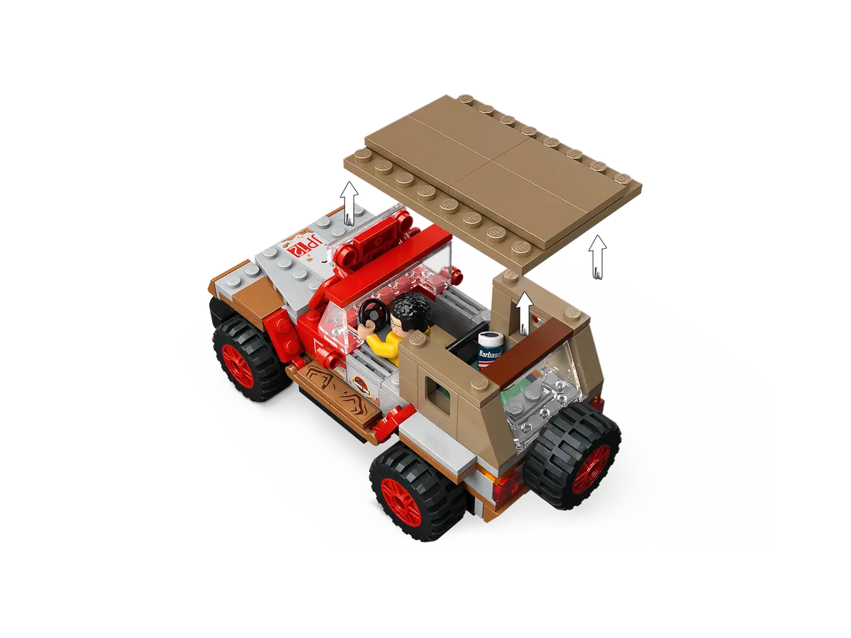 Le set contient une figurine de Dilophosaurus (un peu plus petite que celle du Velociraptor, mais trop grande pour rentrer dans la Jeep…), une minifig de Dennis Nedry, la Jeep Wrangler 12 qu’il conduisait, le panneau qu’il a oblitéré pendant sa fuite… ainsi que la fameuse, la célèbre, l’illustre canette Barbasol.