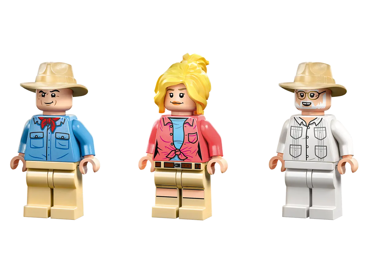 Enfin, le set nous propose les minifigs de John Hammond (équipé de sa canne rehaussée de son fossile), Ellie Sattler et Alan Grant et sa griffe de raptor.