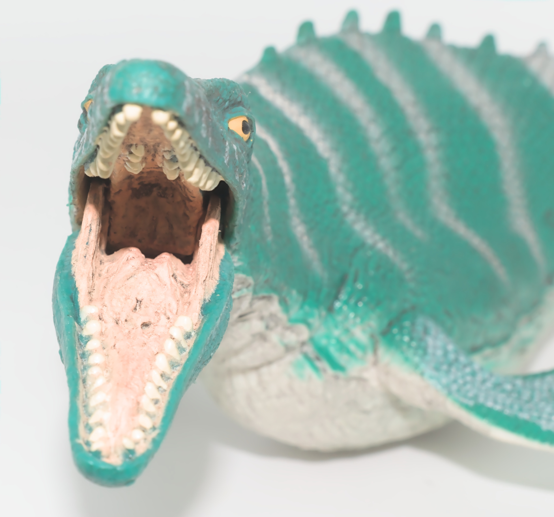 Et cette figurine, bien que souffrant de défauts mineurs, est assez impressionnante. De par sa longueur pour commencer : à peine plus courte que l’Agustinia (qui fait 32.9cm). Ensuite, par les détails de sa gueule, qui laisse apparaitre les fameuses dents dont était doté son palais. Ça reste des détails en plastique, mais c’est toujours appréciable de voir que Schleich se soucie du détail.