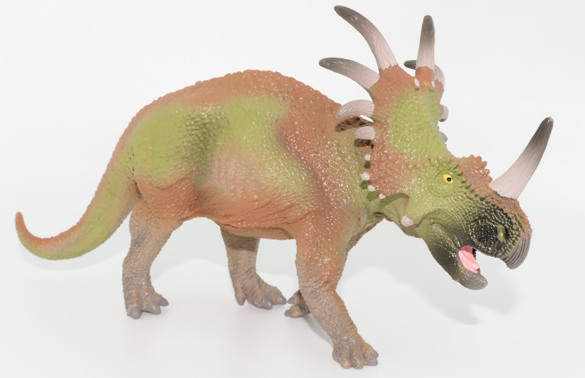 Représentant apprécié de la famille des Ceratopsidae, ce Styracosaurus est plutôt réussi. Paré d’une belle robe verte et brune, d’un museau plus foncé et de pattes tirant vers le gris, les couleurs et dégradés choisis par Schleich sont très bons. La gueule est bien détaillée, les yeux bien dessinés, et les cornes bien colorées.
