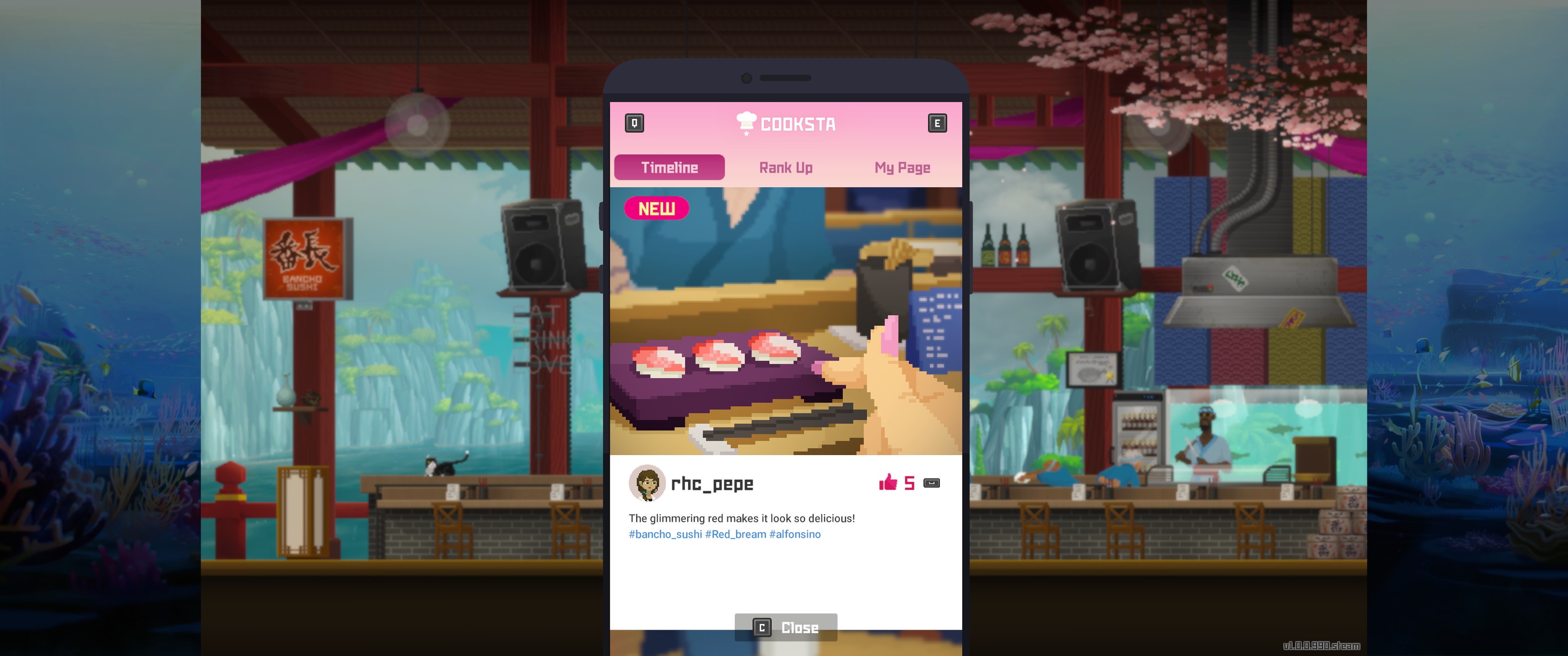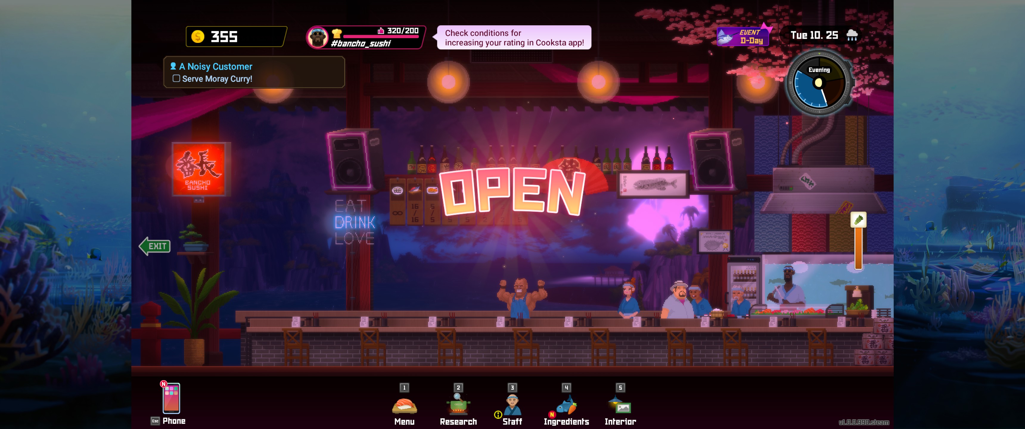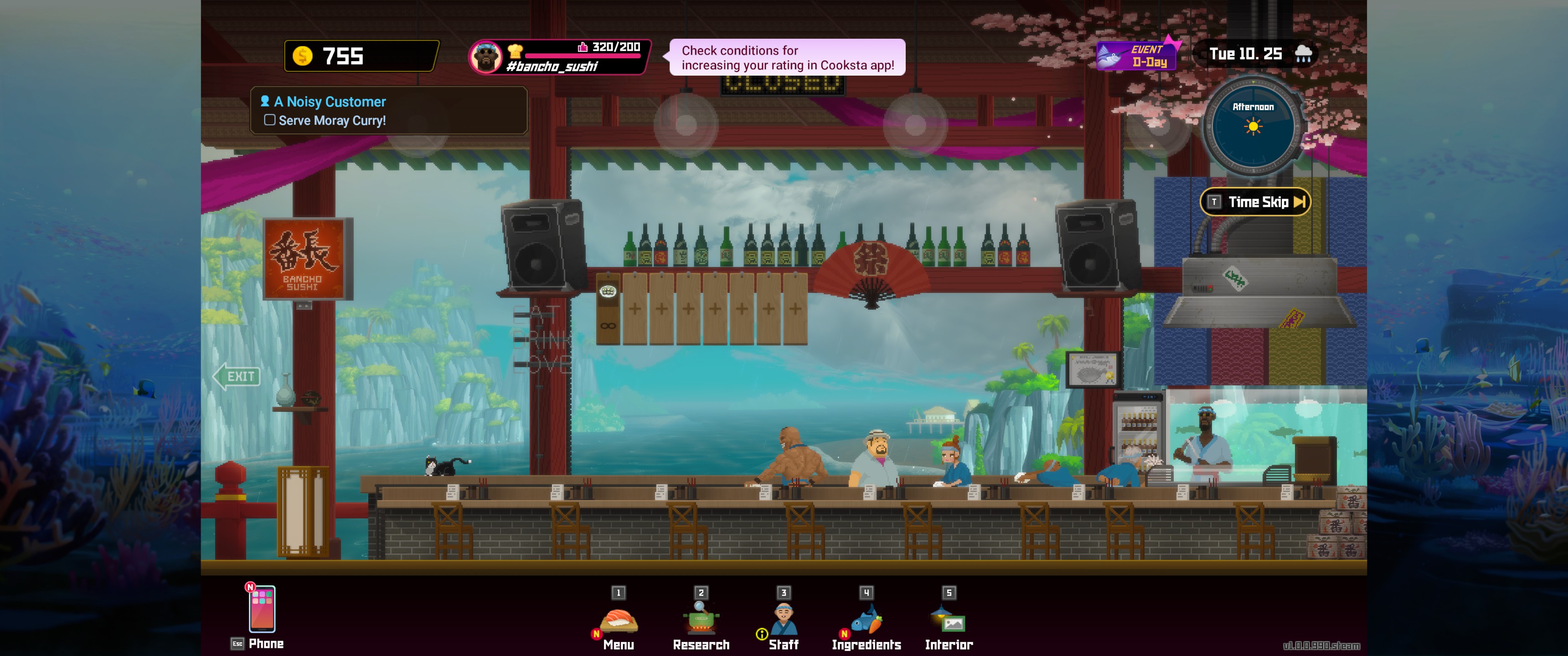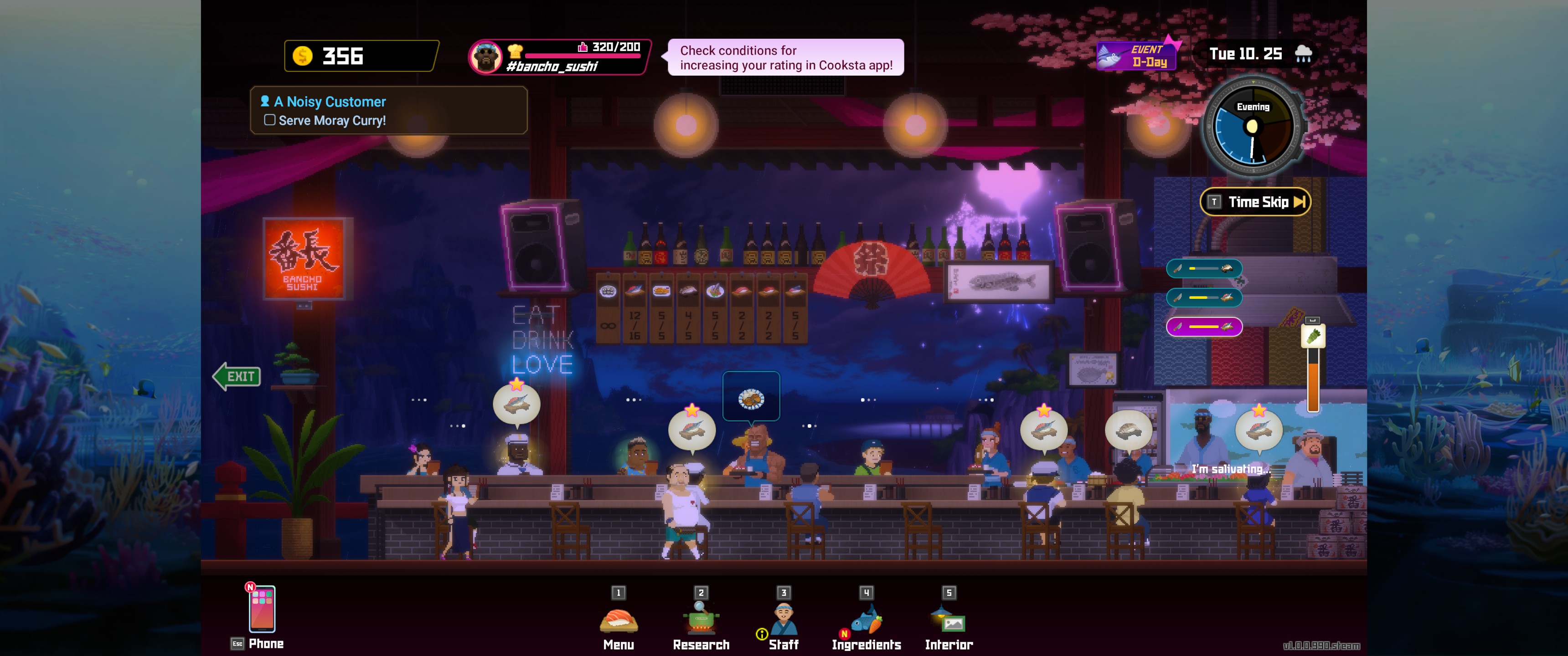 Le but du restaurant est évidemment de rentrer un max de cash en vendant des sushis délicieux et très chers. Il faut donc attirer de la clientèle, tout en prenant soin de l’apparence du bar. On pourra débloquer à cet effet plein de décorations pour agrémenter le restaurant, mais on pourra aussi faire de la pub et utiliser le (faux, heureusement) réseau social intégré au téléphone de Dave, qui permet d’ailleurs tout un tas de choses.