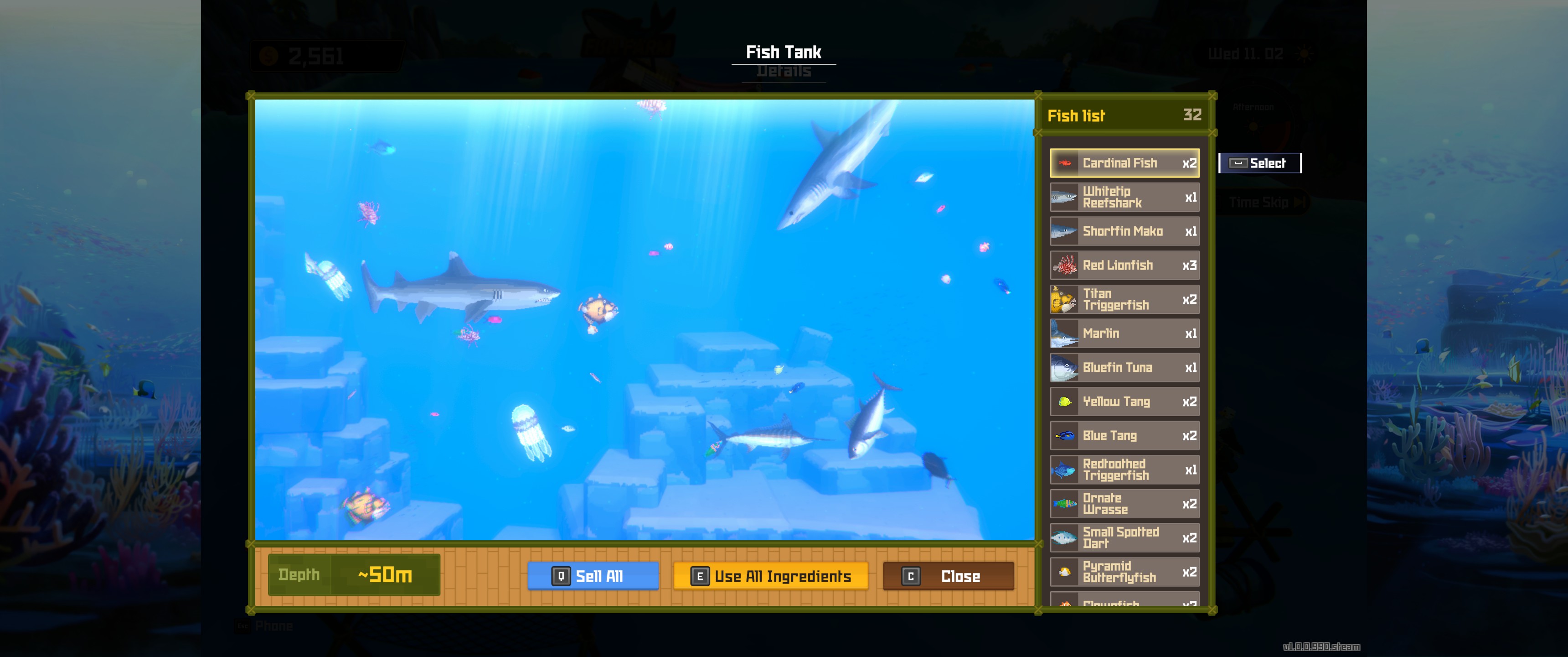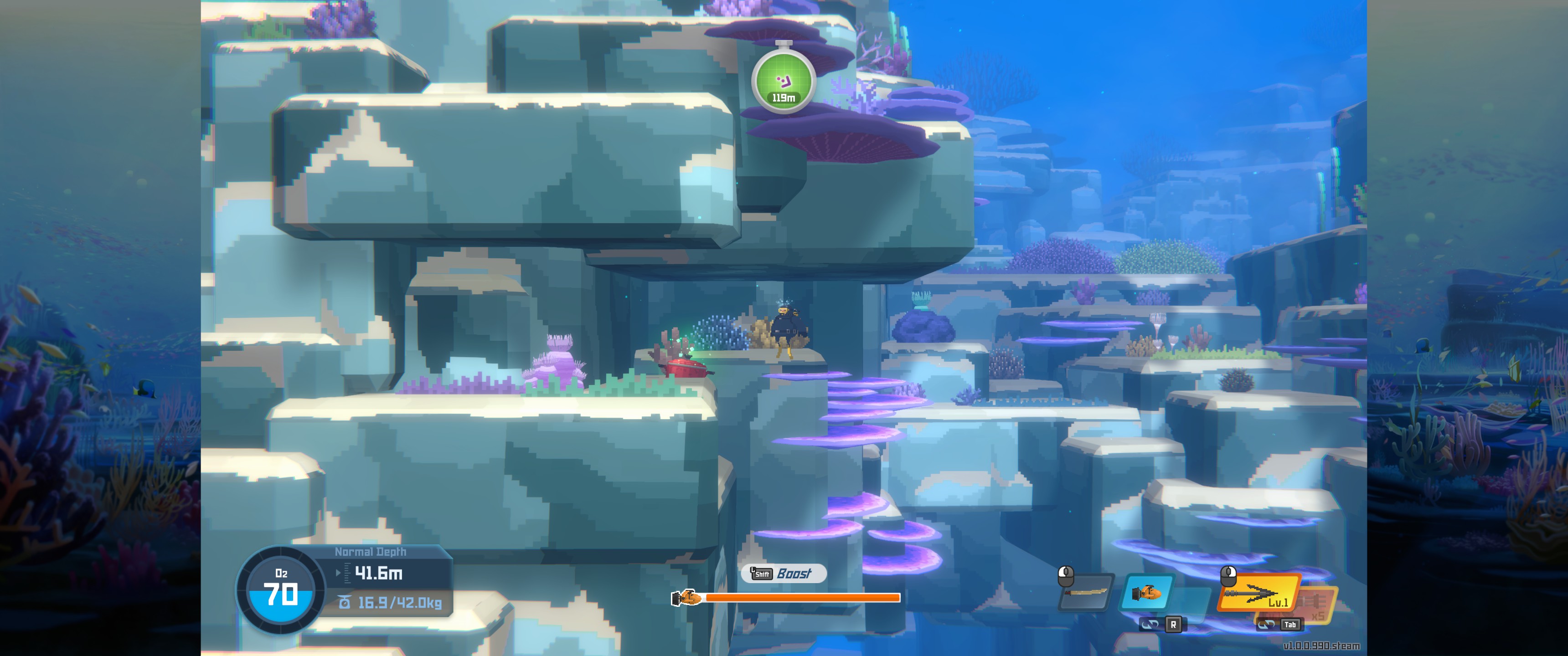 Le jeu est globalement divisé en deux séquences jouées en alternance : une phase de plongée sous-marine et une phase de gestion de restaurant, le tout saupoudré d’éléments de RPG, quoique je trouve ce rapprochement abusif. Ce que l’on veut dire par là, c’est qu’il y a des mécaniques de progression.