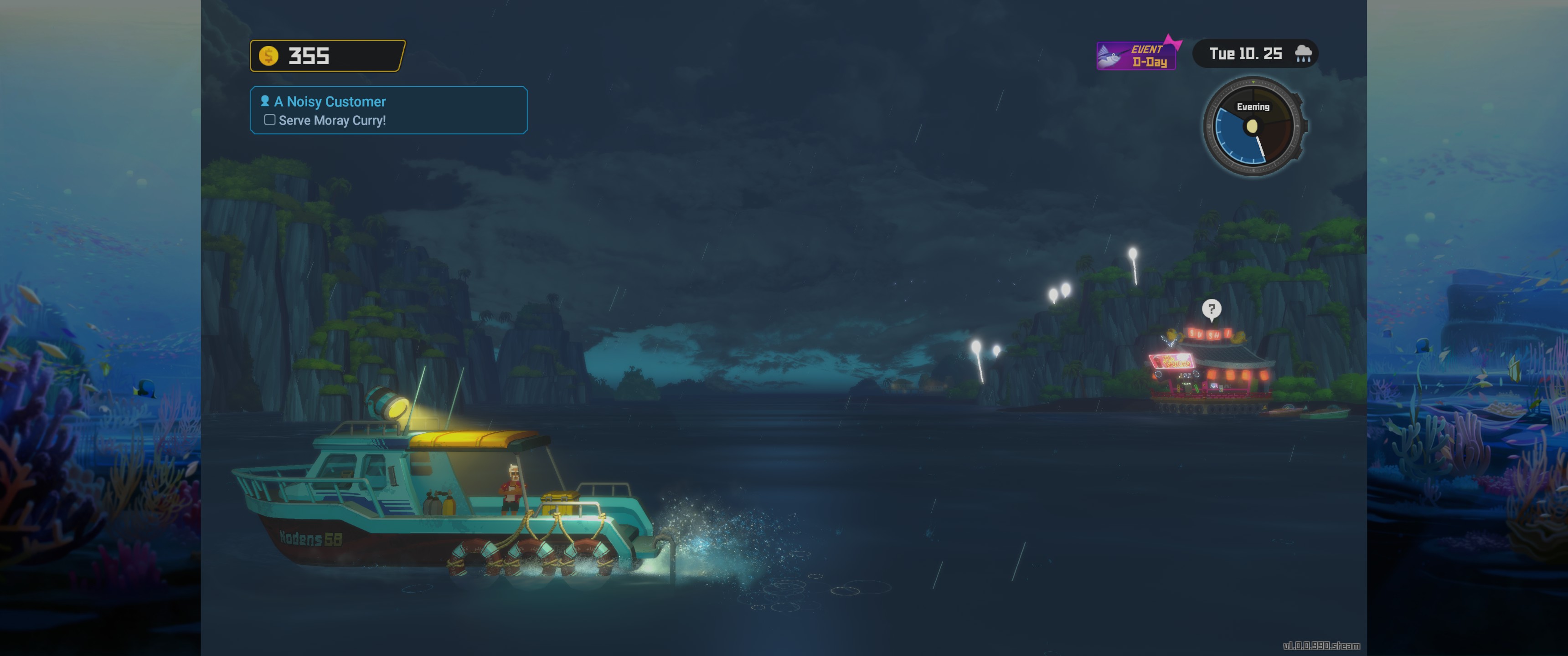 Je ne vous spoilerai pas, mais sachez que plein d’autres activités sont faisables, débloquées au fur et à mesure de la progression. Ces activités évitent l’ennui que peuvent représenter les allées et venues entre le bateau et le restaurant du début de partie. Ces activités se feront soit le matin, avant tout le reste, ou la nuit, grignotant une partie du temps consacré à l’ouverture du restaurant. On choisira donc parfois de sacrifier quelques heures rentables de restaurant pour obtenir un élément qui le rendra encore plus rentable plus tard.