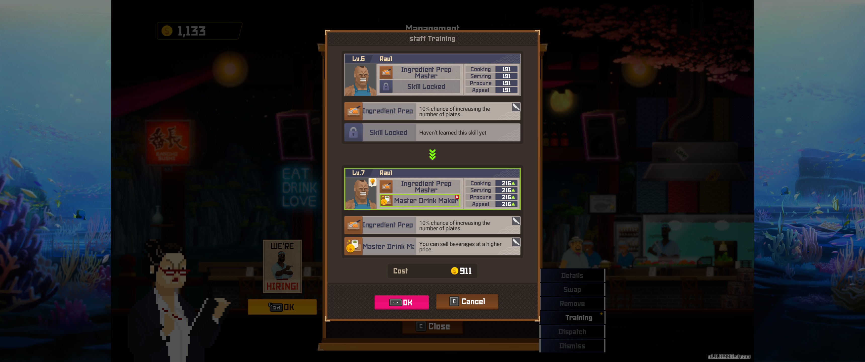 Vous le verrez très vite, gérer seul la salle est un fardeau. Dave se traîne et ne peut pas satisfaire la clientèle seul. Alors vous devrez embaucher, lancer les offres, voir ce que proposent les candidats, et affecter ceux de votre choix aux tâches de cuisine ou de salle, tout en veillant à changer quotidiennement la composition des menus en fonction des retours de la journée.