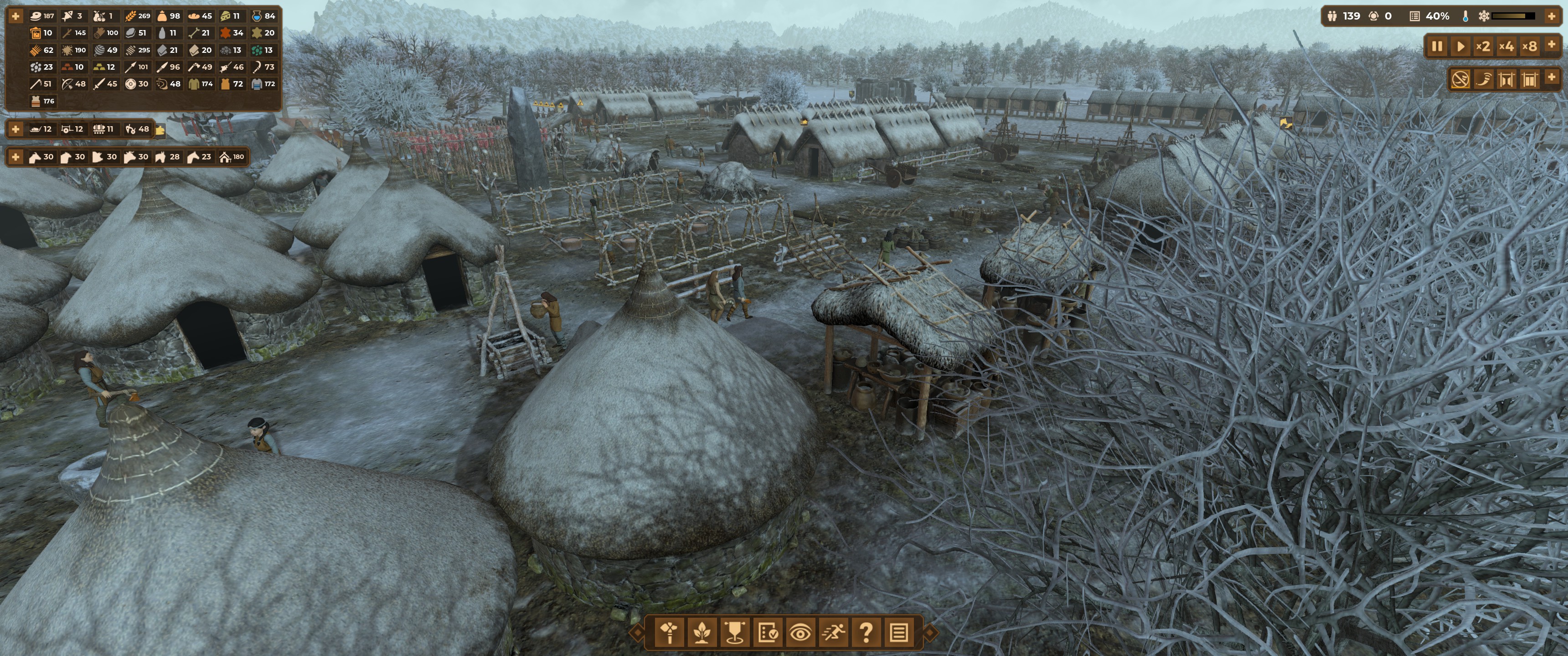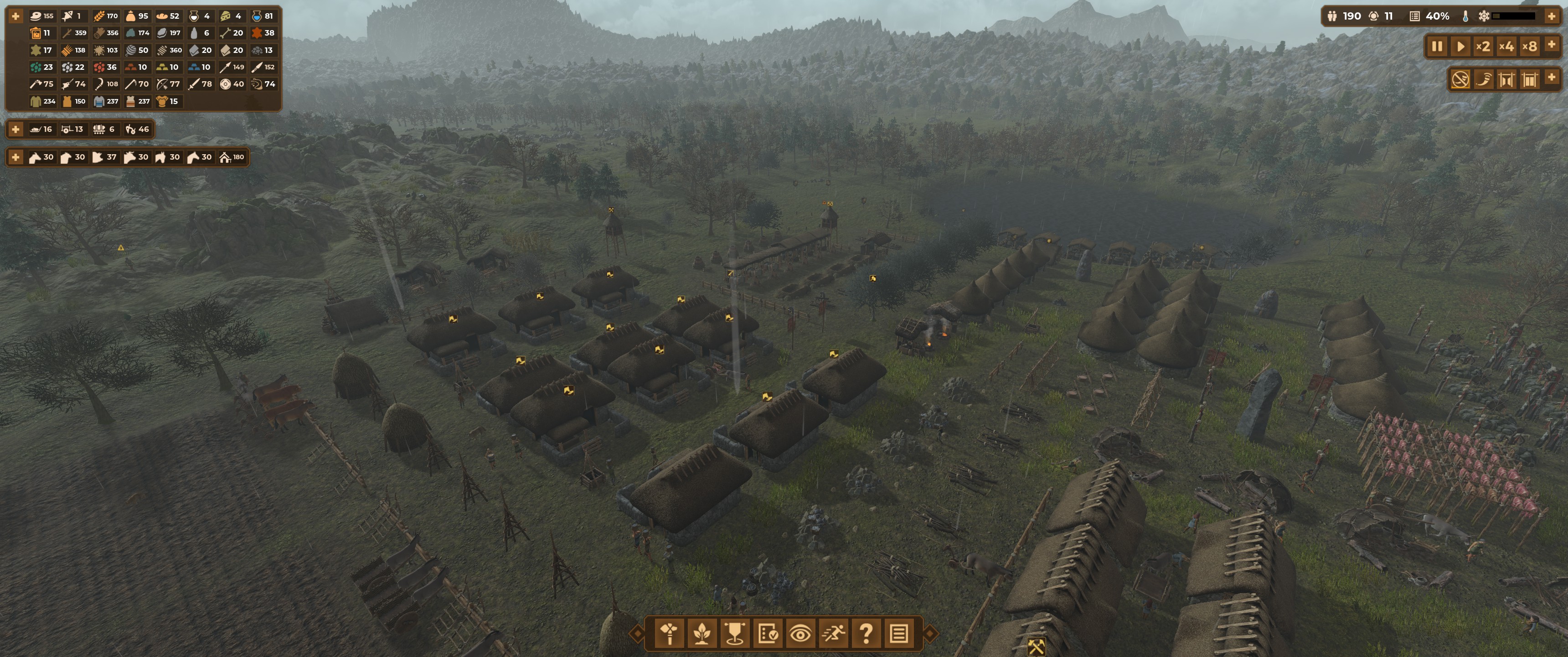 On a pris l’habitude avec les city-builders modernes de sélectionner de larges portions de terrains pour y réaliser des constructions avec pour “seule” limite l’argent : la richesse de ces jeux est ailleurs. En ce qui concerne DoM, c’est exactement l’inverse : il n’est jamais question d’argent, mais il est toujours question de répartition des tâches. Chaque construction de la moindre maison ou de la moindre parcelle agricole sera réfléchie, non seulement parce que les ressources n’abondent pas mais aussi parce que la saisonnalité a son importance.