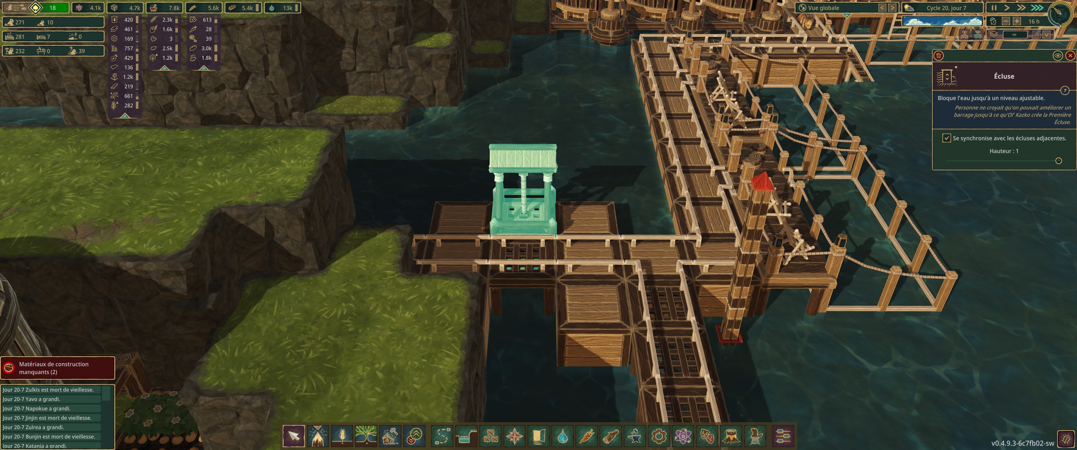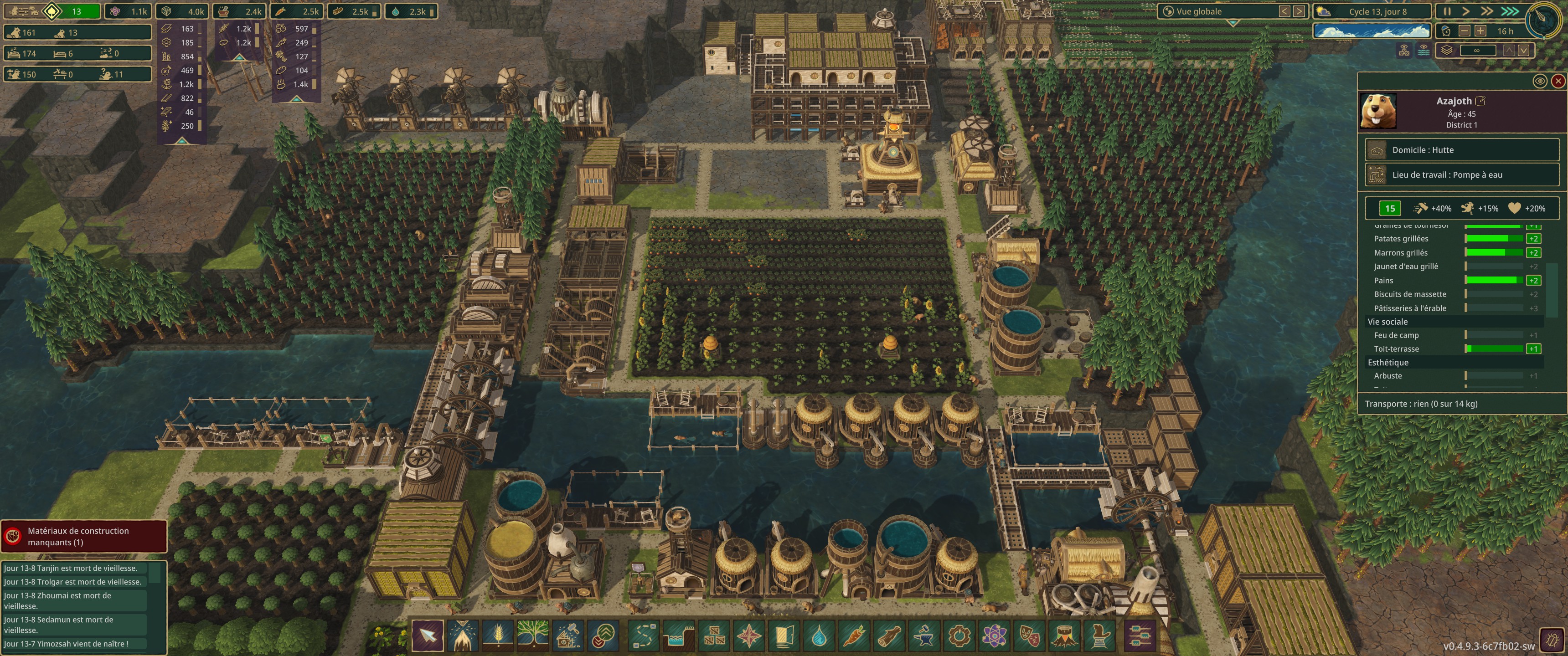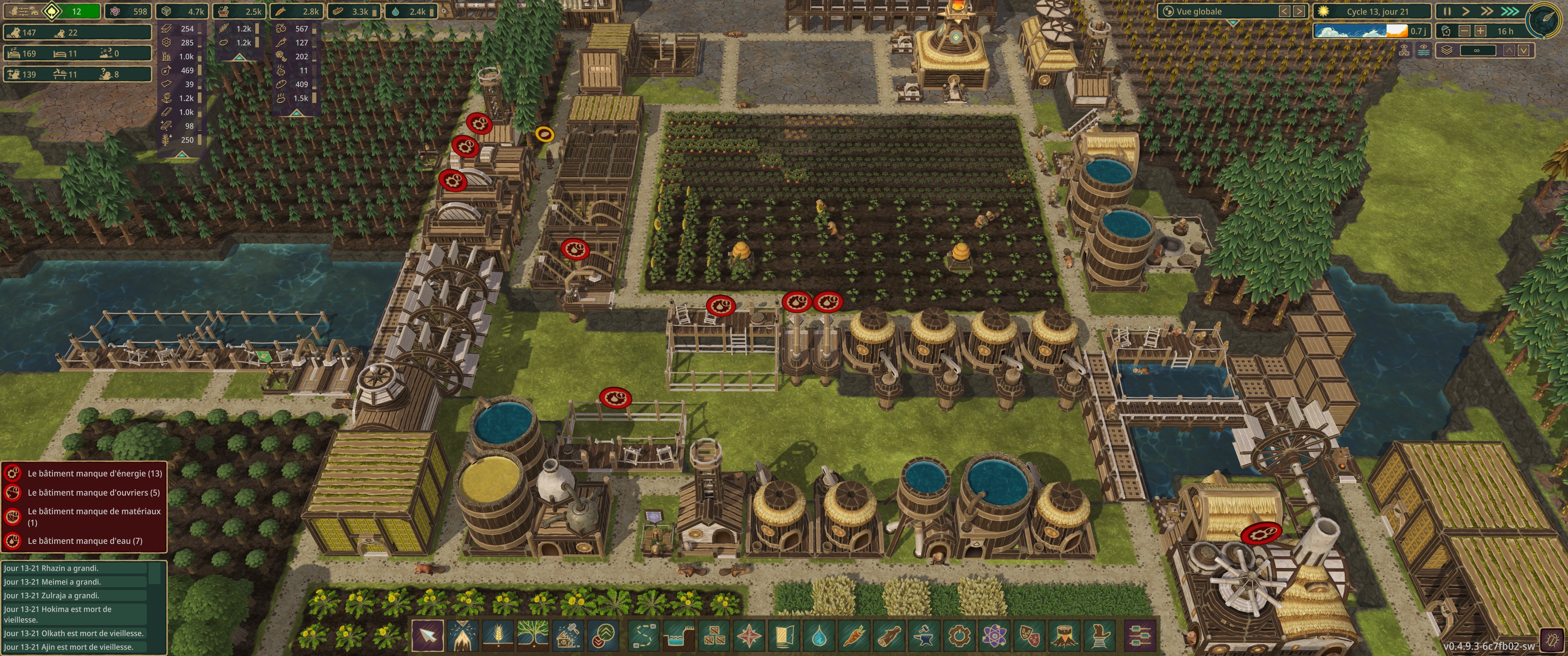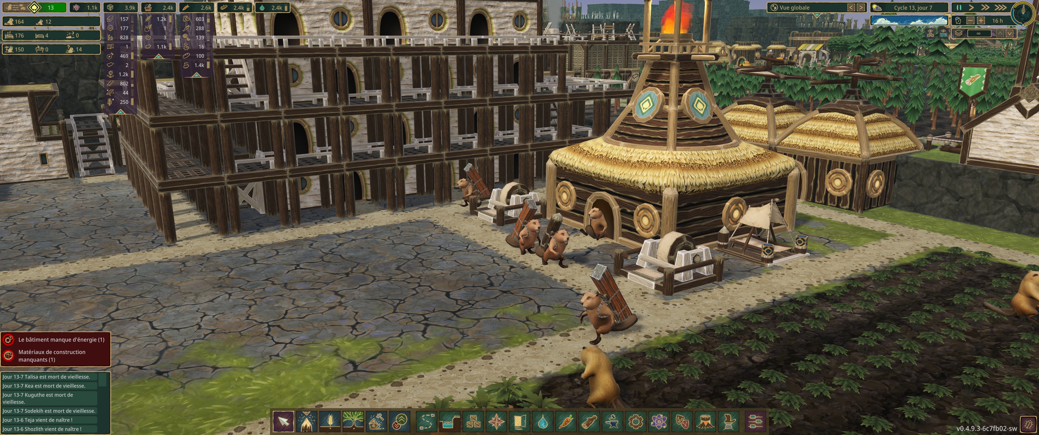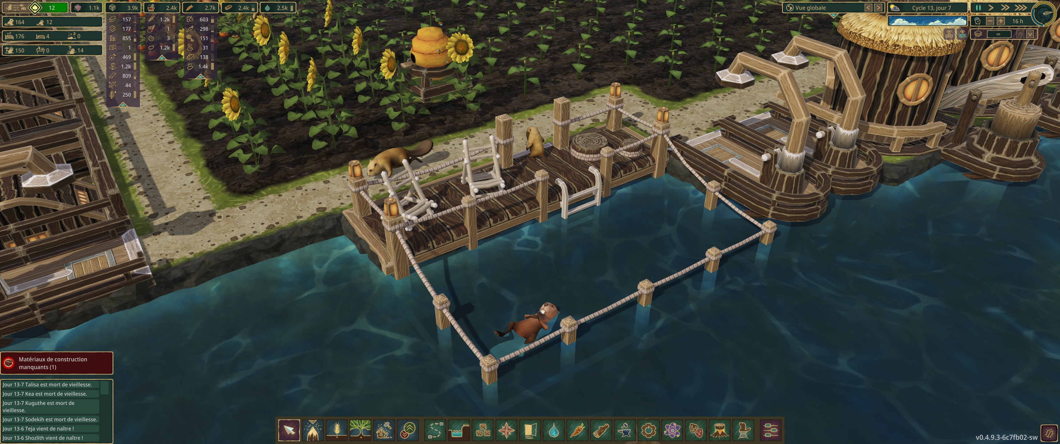 Évidemment, la solution éolienne ne supplée pas totalement à l’énergie hydraulique, y compris en période de sécheresse : le vent aussi va et vient comme bon lui semble, et tout ce que l’on peut faire, c’est minimiser les pertes de travail que cela occasionne. Cependant, cet équilibre est moins pénible à maintenir qu’il n’y parait : rien, dans Timberborn, ne donne l’impression d’être contraignant ; on n’a pas l’impression de s’infliger des tâches rébarbatives alors qu’on est dans un jeu, tout simplement parce que les conséquences de défauts de gestion ne sont pas punitives. J’ignore à l’heure actuelle si c’est parce que je joue “correctement”, mais je n’ai jamais vu un de mes castors mourir pour une autre raison que la vieillesse ; pourtant, au cours de la même partie, ils ont vécu la famine, la fatigue, les blessures, l’isolement1 et la déshydratation…