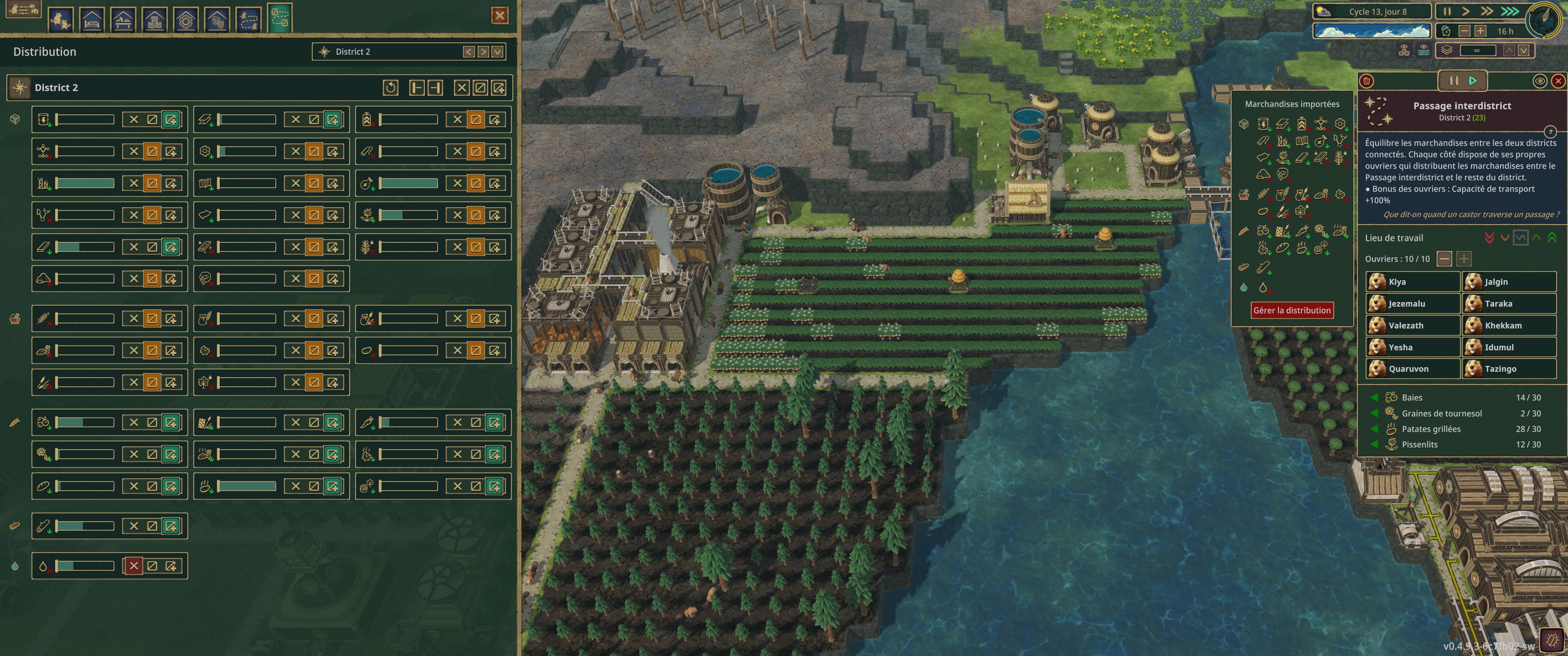 Autre caractéristique intéressante de Timberborn, la gestion des districts : un district peut s’étendre sur des dimensions “restreintes”, “limitées” par la longueur des chemins créés. J’emploie les guillemets parce qu’il n’y a pas de limite “dure” : c’est juste que plus les chemins sont longs, plus longtemps les castors vont mettre pour rejoindre deux points. Par soucis d’optimisation, on créera donc un nouveau district.