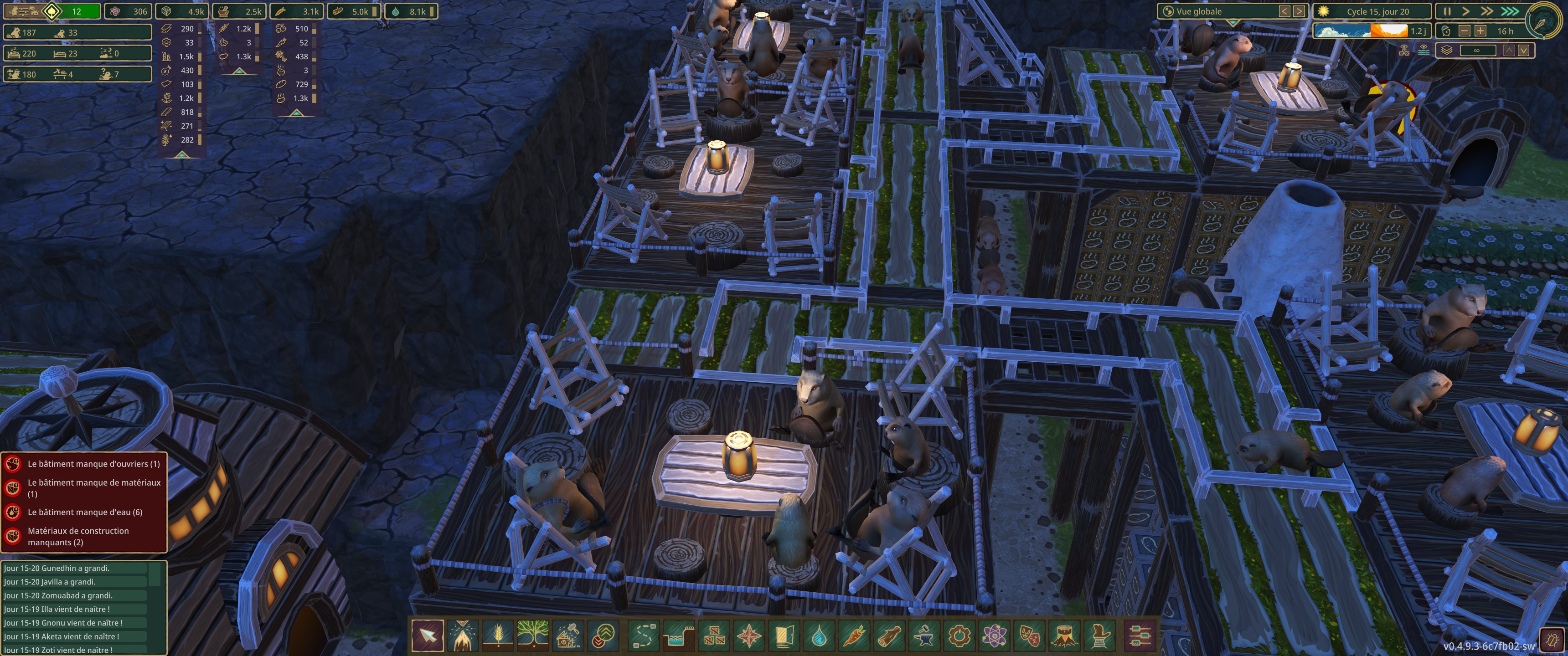 Alors que l’on doit se développer progressivement, petit à petit, les journées sont très courtes et s’enchaînent très vite. C’est là le plus gros défaut du jeu : ce rythme est à l’origine de temps d’attente, parfois très long, jusqu’à la complétion d’une tâche, puisqu’elle est entrecoupée de pauses pour le repos nocturne des castors. On se retrouve fréquemment dans une situation où l’on n’a rien à faire : on a déjà donné tous nos ordres aux castors, on doit juste attendre pour qu’ils terminent leurs tâches, parfois longtemps le temps de rassembler les ressources.