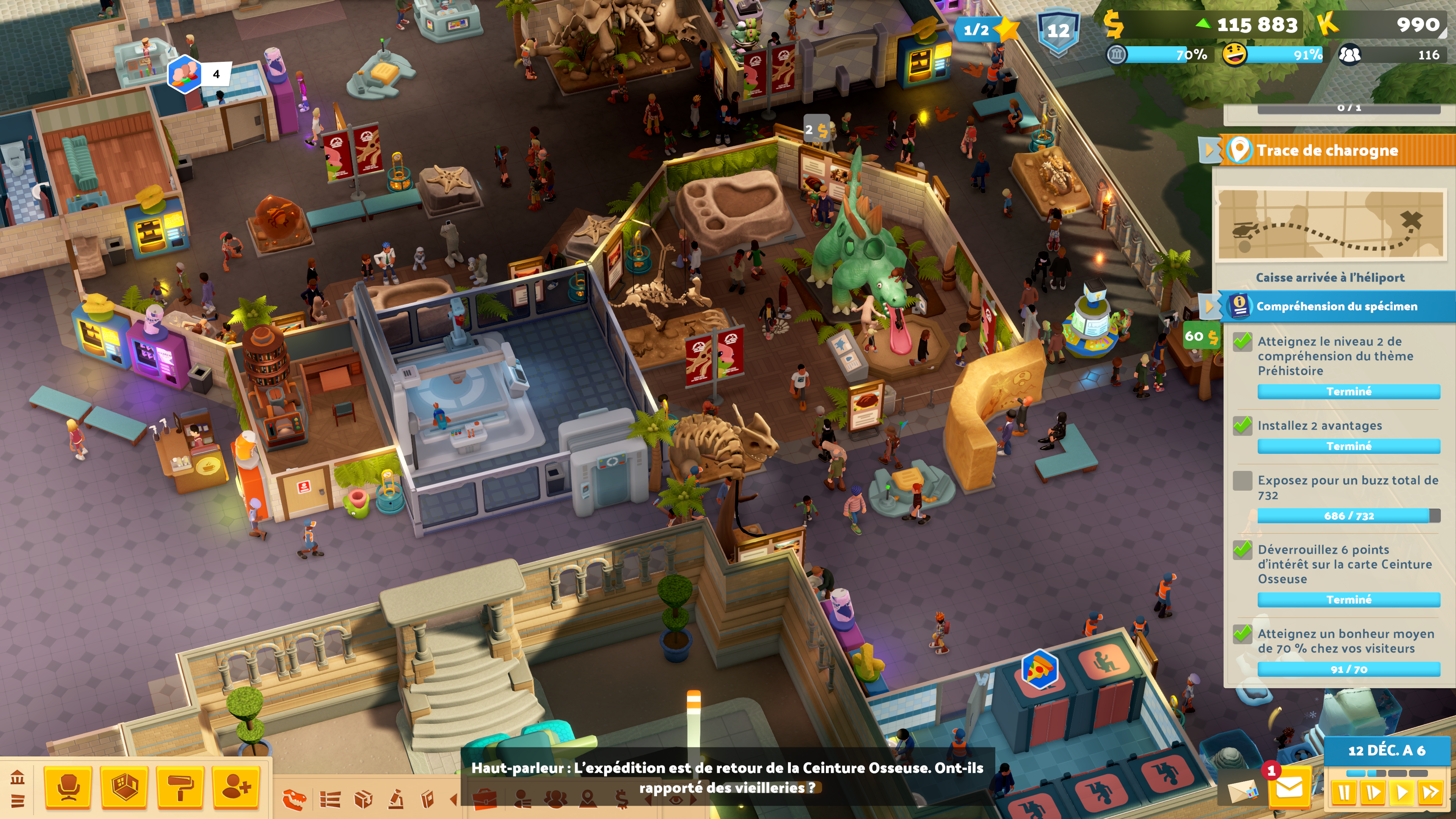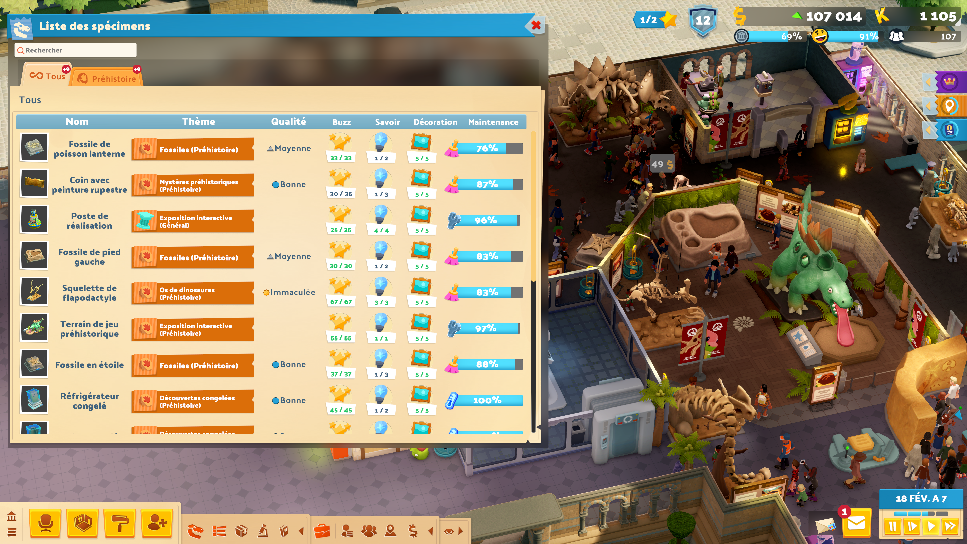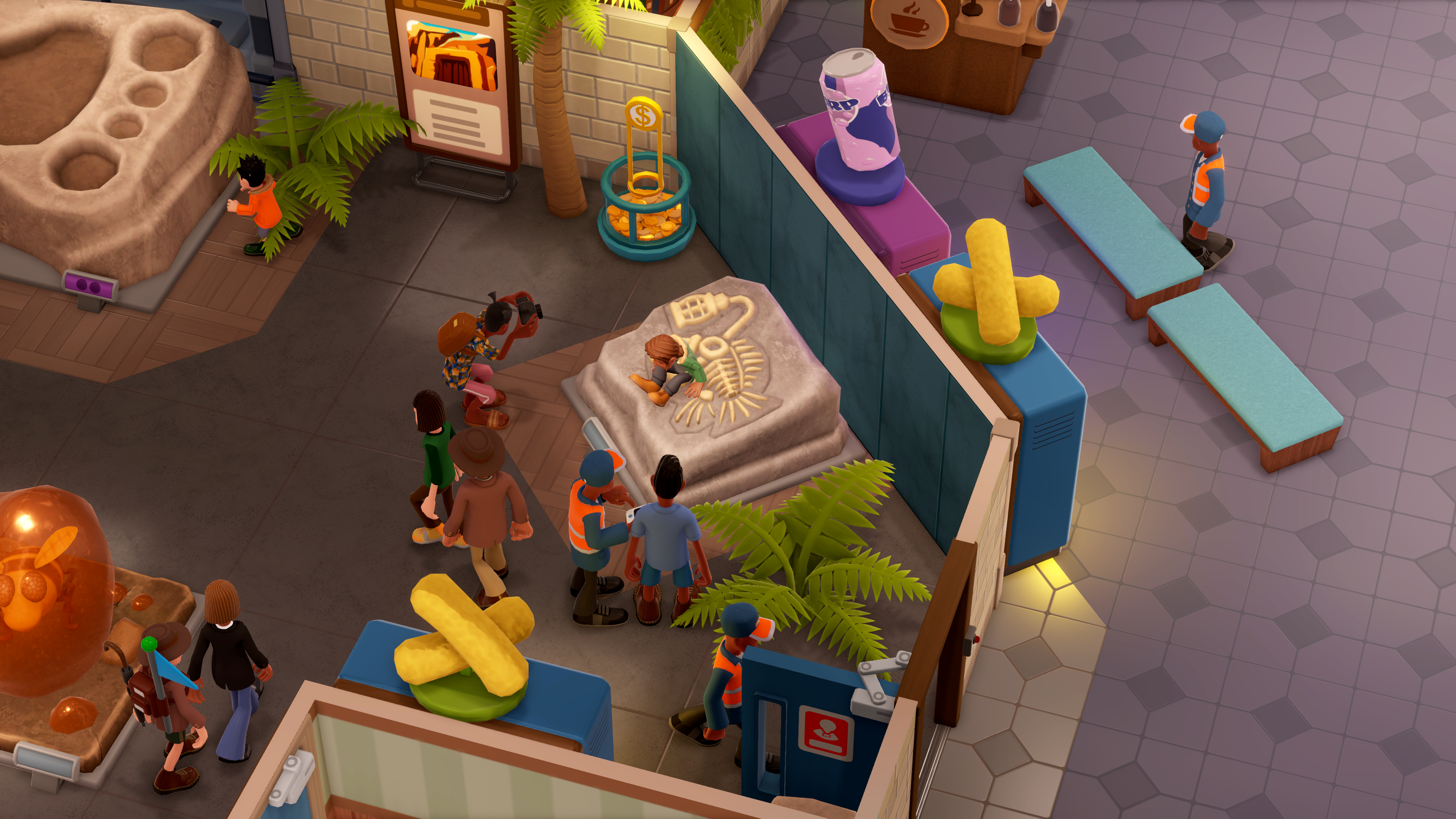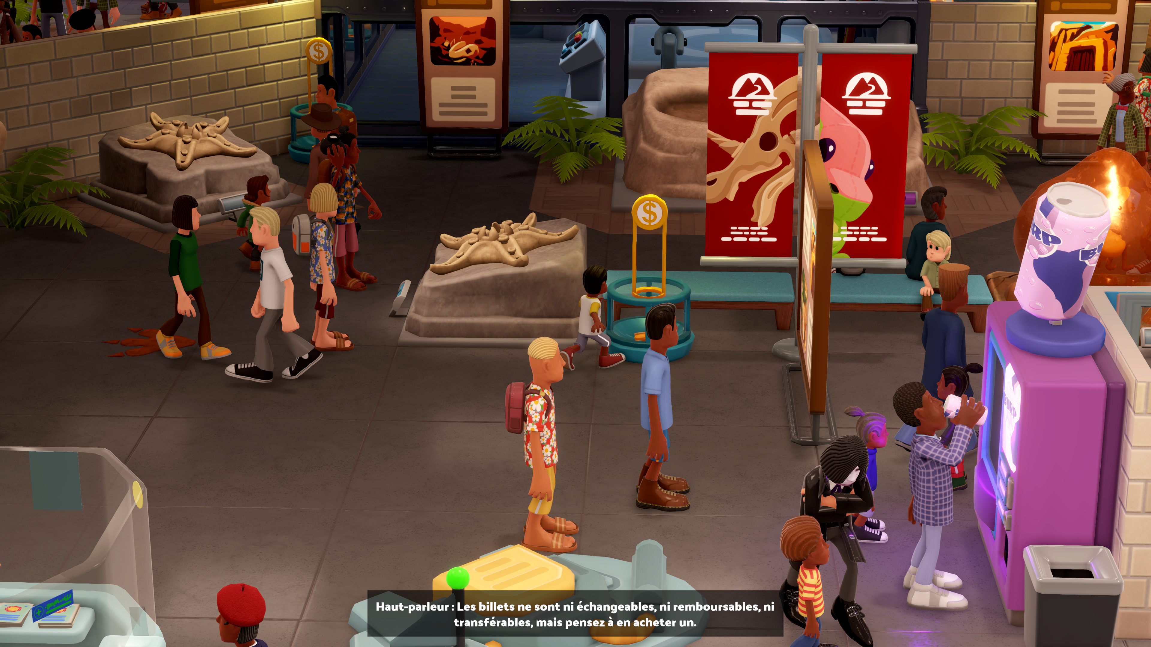 La dernière étape d’acceptation s’est produite en entendant la “petite voix” du musée (que je suis certain de reconnaître du film Jurassic World sans pour autant en avoir confirmation) faire ses annonces à intervalles réguliers. Subitement, cette esthétique et ce manque de réalisme avaient du sens : Two Point Museum est très sérieusement un jeu impertinent (ou l’inverse).