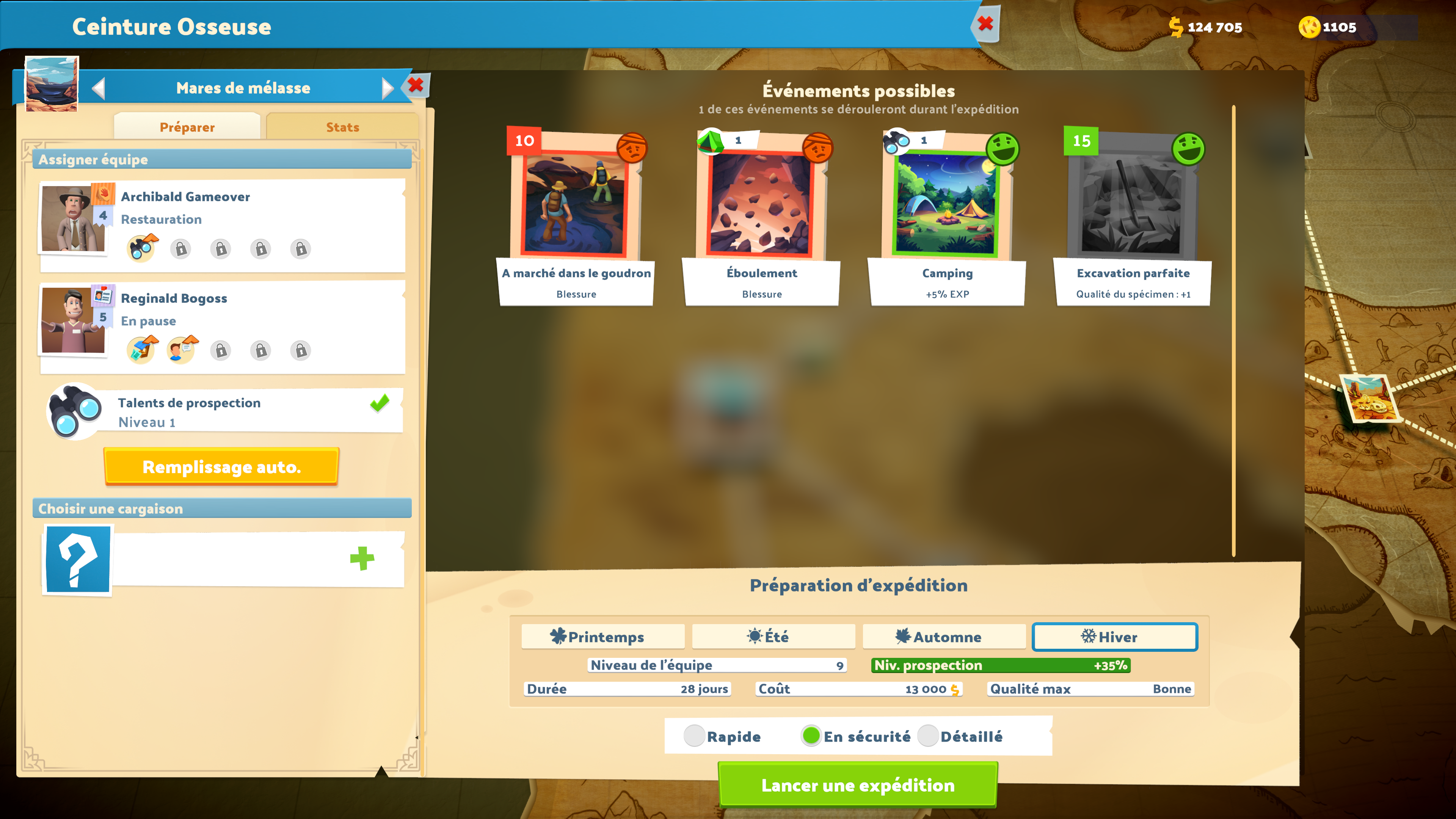 L’écran de préparation d’une expédition. Chaque expédition a ses propres dangers (qui peuvent varier en fonction de la saison)