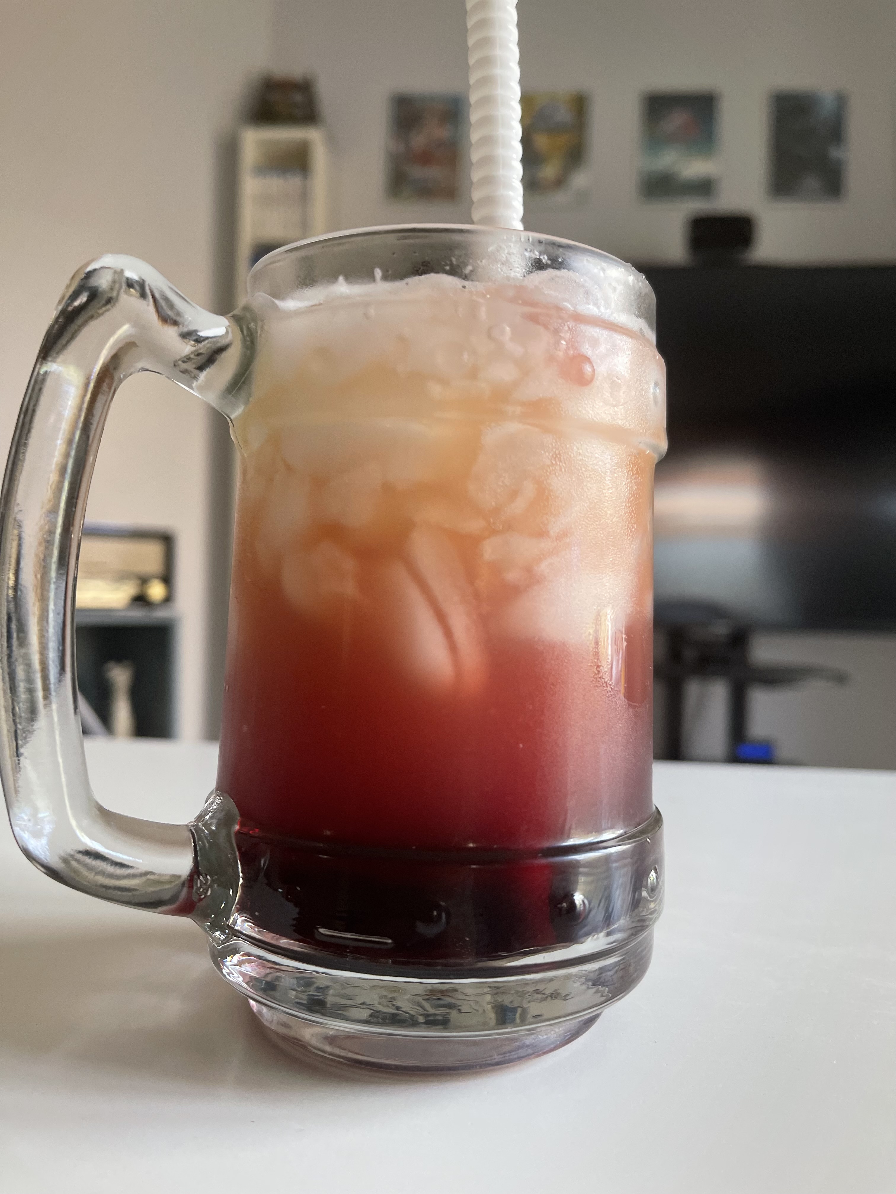 - Un Jurassic Sunset, cocktail à base de sirop de cerise, de jus de raisin, de rhum et de jus d’ananas, excellent :