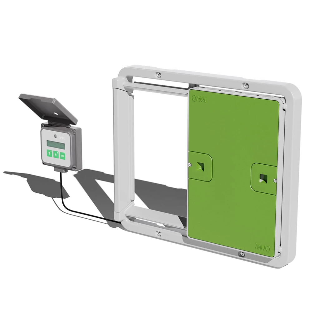 On notera que le boîtier de la porte automatique nécessite quatre piles ou accus au format AA/LR06 qu’on devra remplacer ou recharger tous les six mois environ. Omlet propose aussi un adaptateur secteur, mais on aurait préféré un panneau solaire ! Omlet, si vous me lisez…