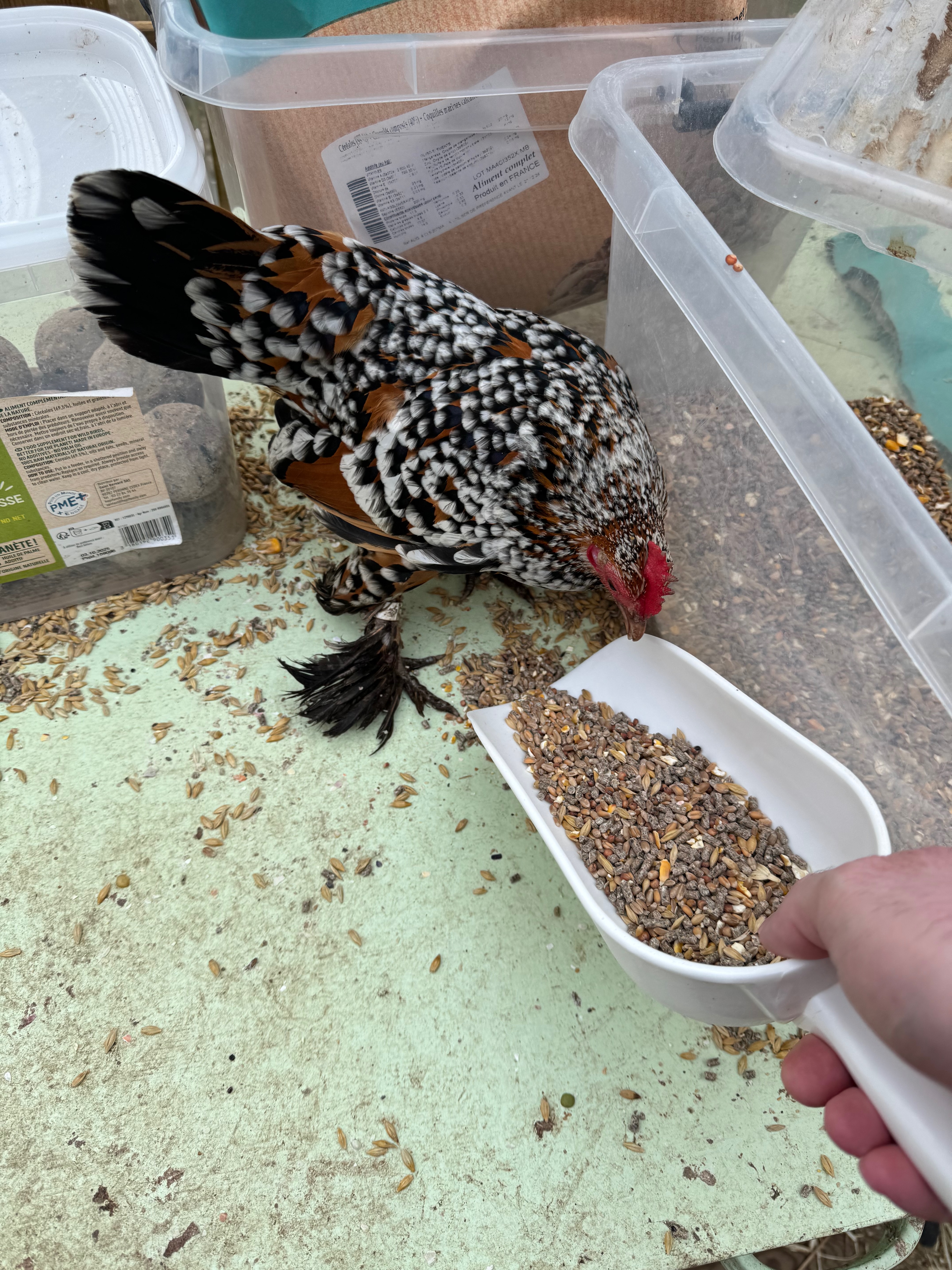 Ça peut même devenir un moment particulièrement agréable lorsque les poulettes observent notre travail, avec de la reconnaissance visible dans leur oeil !