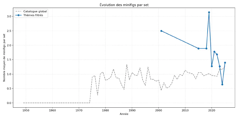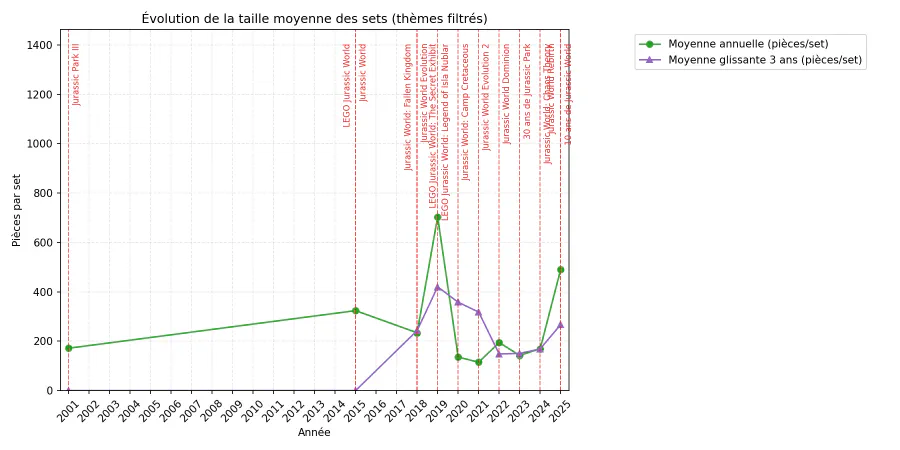 J’ai choisi dans ce graphique d’intégrer les données de tout le catalogue. On peut se rendre compte que les premières minifigs LEGO ont été introduites en 1975 (25 au total), mais l’intérêt principal de ce graphique était plutôt de montrer si le nombre moyen de minifigs par set pour les thèmes filtrés était supérieur ou inférieur à la moyenne globale. Il apparait qu’à l’exception de 2024, les sets Jurassic World contiennent plus de minifigs que la moyenne. Cependant, cette tendance semble diminuer (contrairement à la tendance globale), sans pour autant que ce soit alarmant, comme le confirme le graphique suivant.