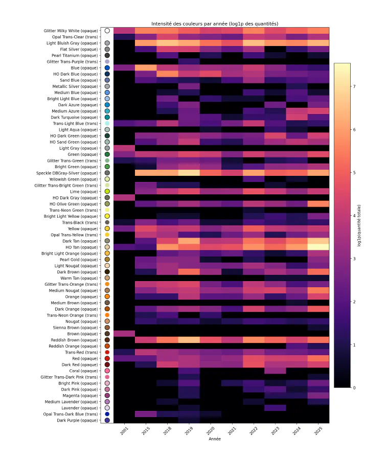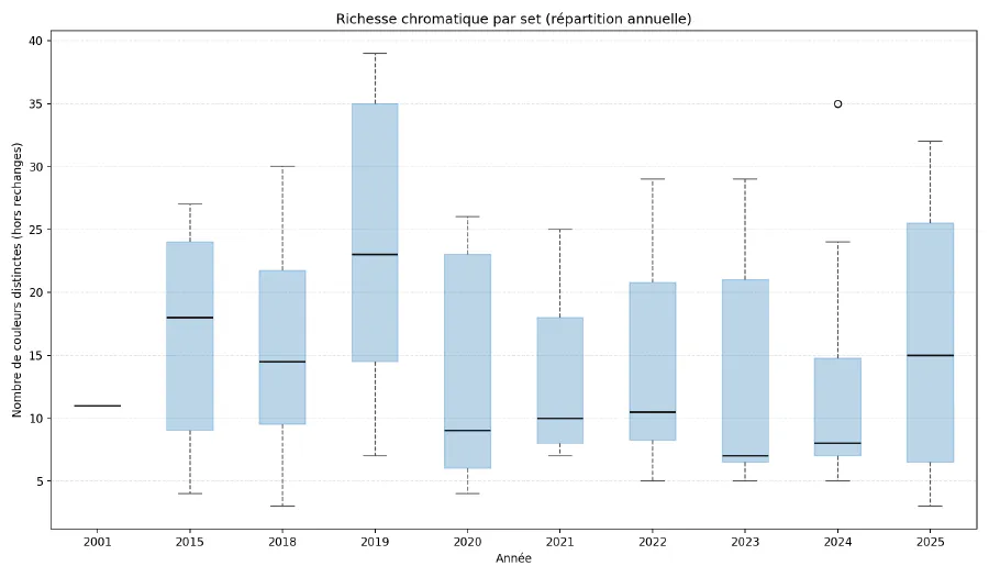 L’assombrissement des bandes correspondant aux périodes allant de 2016 à 2017, puis dans une moindre mesure de 2023 à 2024, trahis une quantité de pièces par set moindre, ce qui n’a pas empêché LEGO de proposer des sets aux couleurs variées, et donc une palette travaillée.