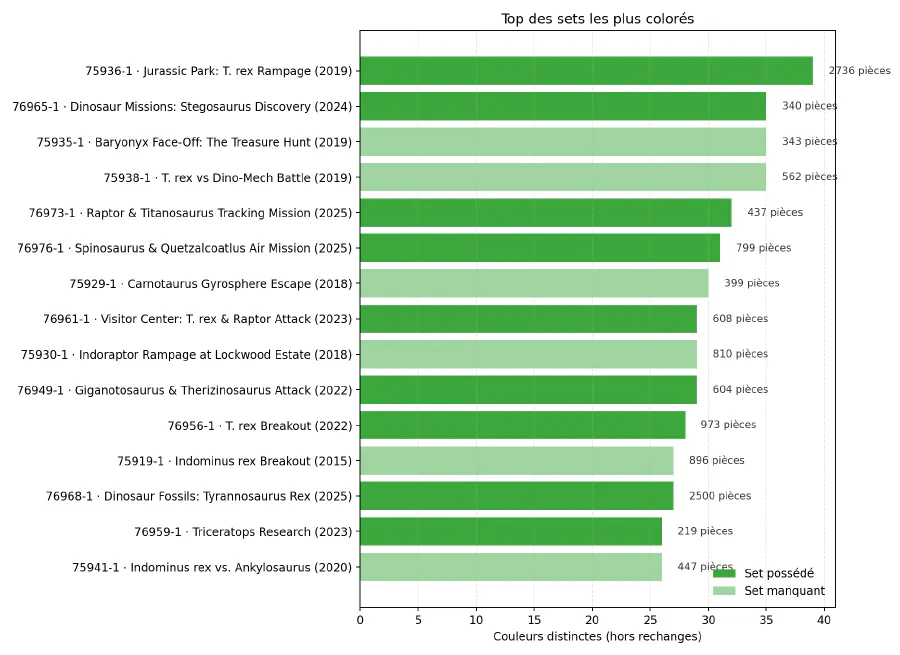 On remarque d’ailleurs que le set 76968, Dinosaur Fossils: Tyrannosaurus Rex, culminant à 3145 pièces devant 75936, Jurassic Park: T. rex Rampage avec 3120 pièces, est absent de ce graphique puisqu’il n’exploite “que” 22 couleurs différentes.