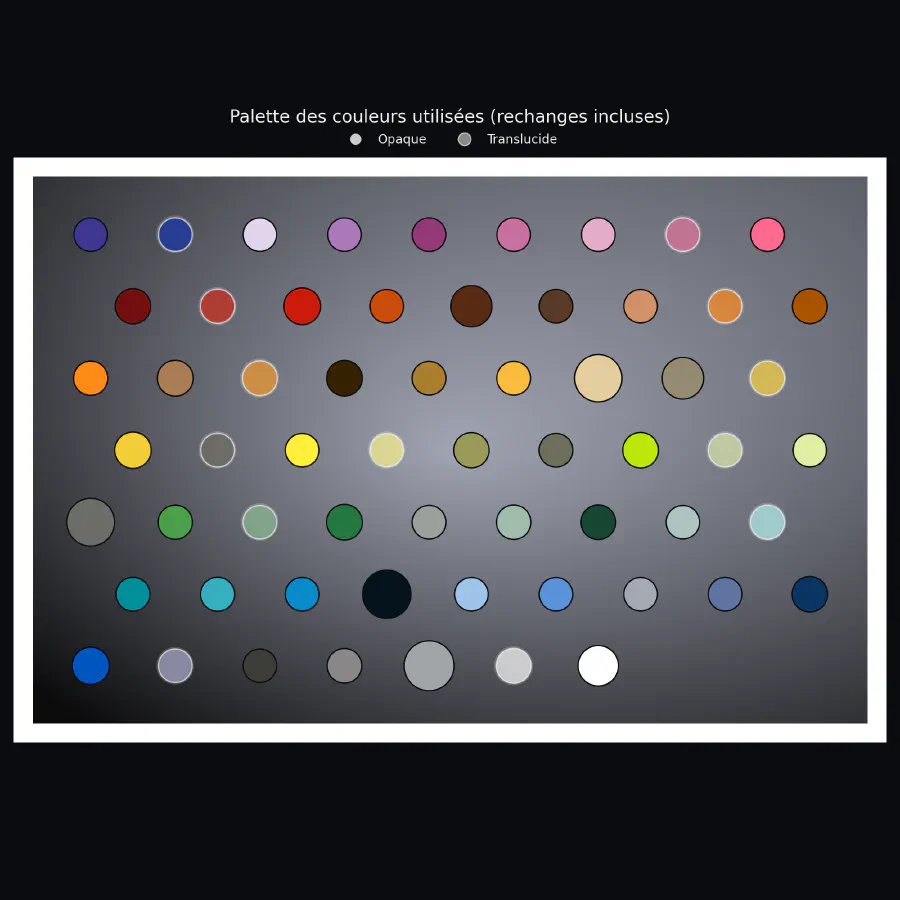 On reconnait même, dans les couleurs les plus employées chaque année (les cases les plus claires du graphique) les couleurs caractéristiques des œuvres, quoique 2025 reste dominée par le fossile de T. rex et ses couleurs monotones (mais cohérentes), tandis que Rebirth est bien plus vibrant.