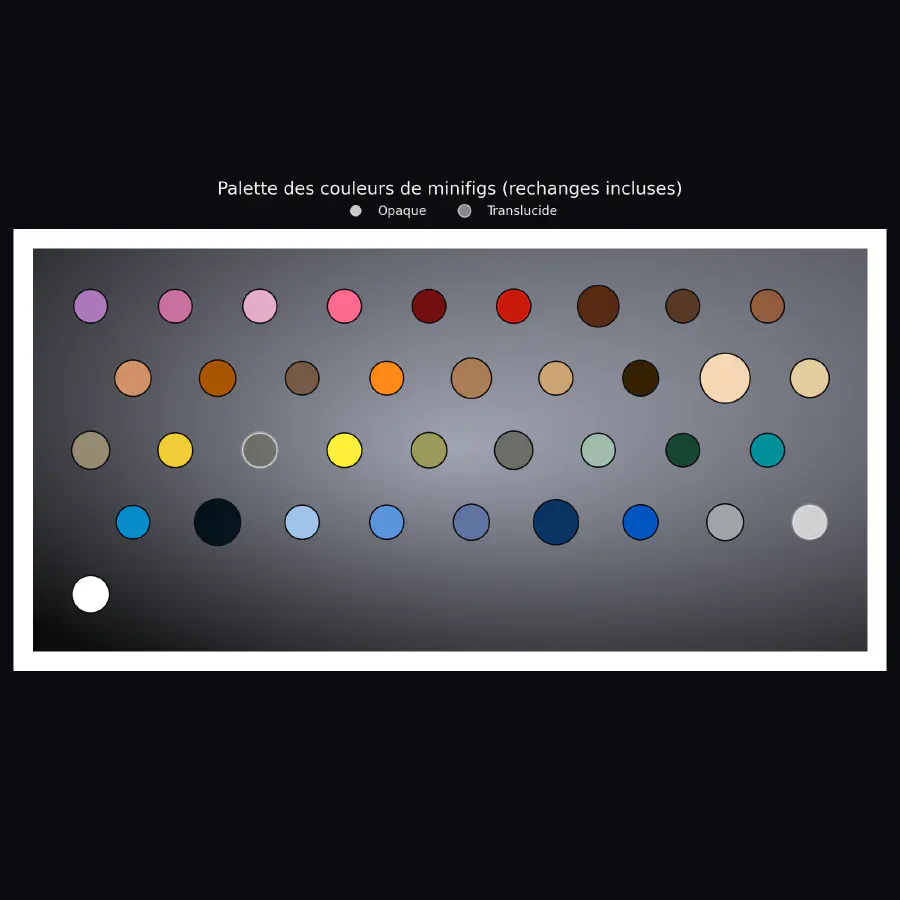 LEGO a utilisé 37 couleurs pour les minifigs des thèmes sélectionnés, dont deux transparentes (des visières pour casque).