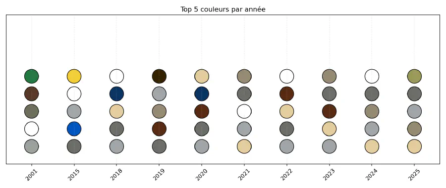 Cette impression se confirme après extraction des 5 couleurs dominantes par an. On retrouve les couleurs caractéristiques :