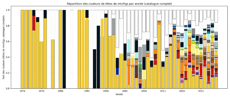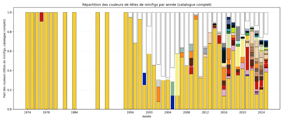 J’analyse ici aussi l’intégralité du catalogue, et pour chaque année, je montre toutes les couleurs utilisées pour les pièces de type “tête de minifig”. C’est peu lisible, mais nous donne une bonne idée de la progression de la diversité globale au fil du temps. Et, force est de constater que cette diversité implique pas mal de couleurs peu réalistes — pour des couleurs de peau. Je vais donc recentrer en filtrant les têtes sur lesquelles il est fait mention d’une impression.
