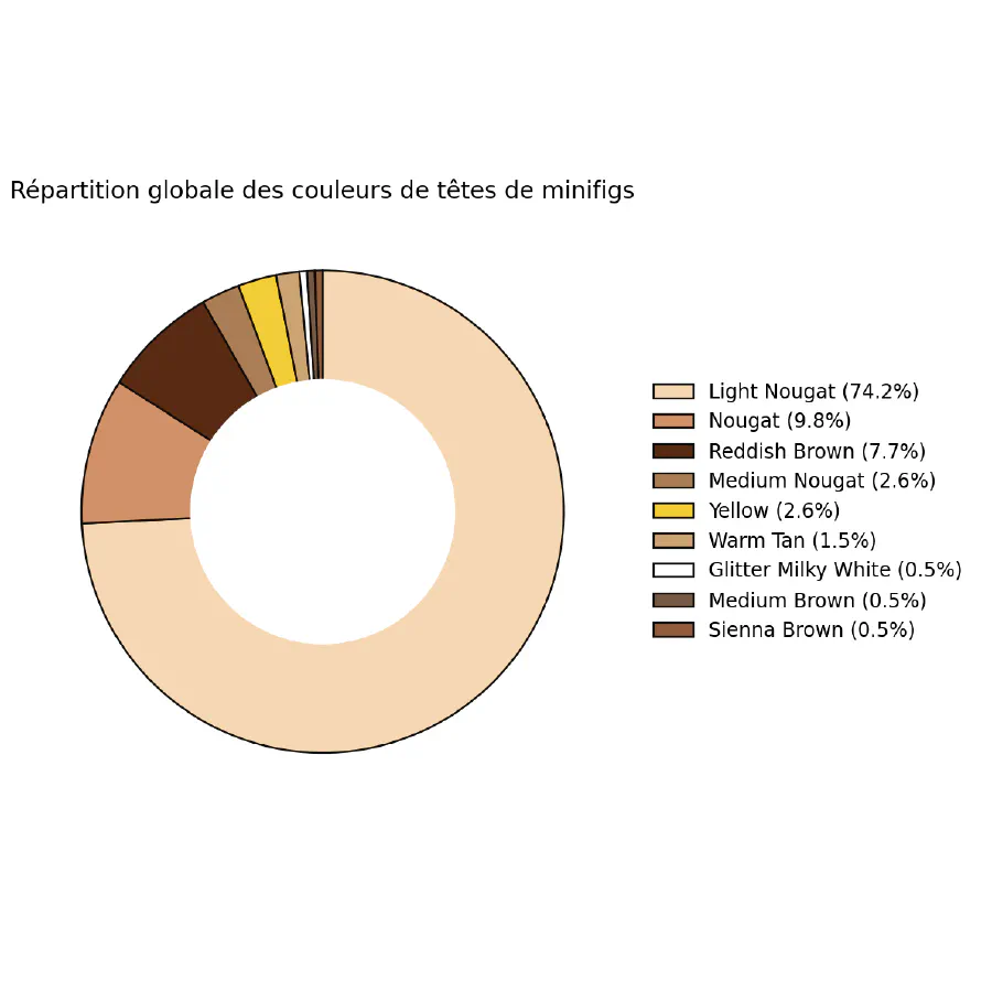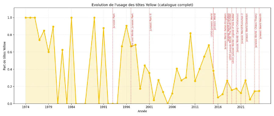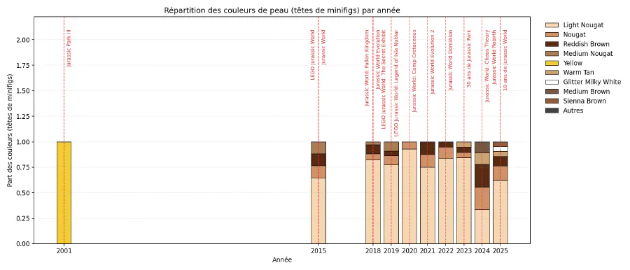 Ma couleur de peau, chez LEGO, s’appelle “Light Nougat”, et je dois dire que ça m’a bien fait marrer 😁 Au-delà de ça, j’ai eu la surprise de voir que LEGO avait utilisé la couleur jaune pour certaines figurines, mais aussi le blanc (qui, en réalité, est détourné par certains sets pour figurer des ossements de dinosaures). Du coup, j’ai voulu voir quelle était la répartition annuelle de ces couleurs.