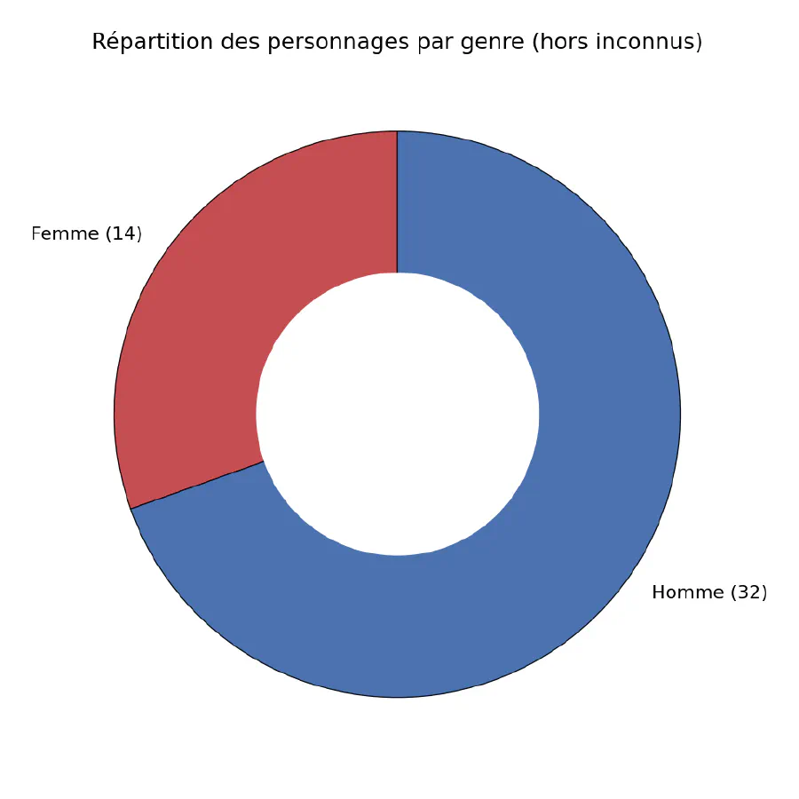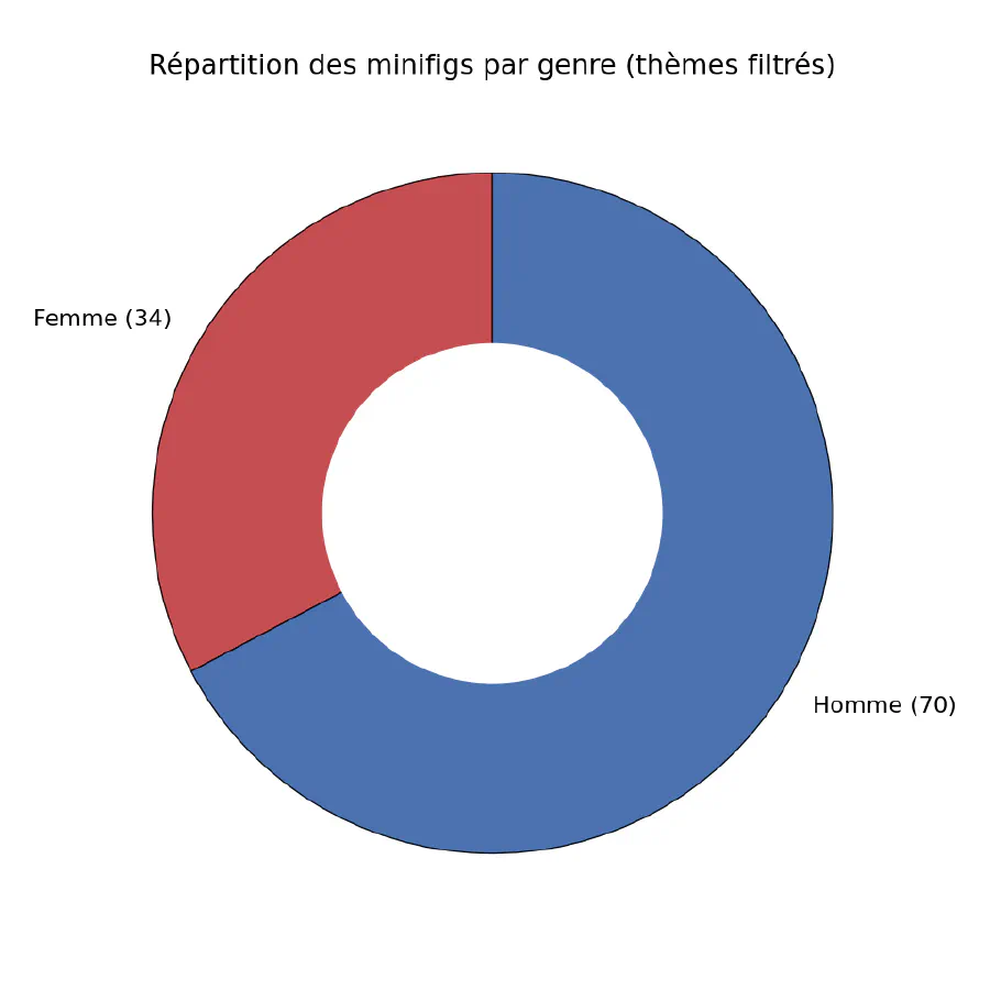 Sans surprise, les deux tiers des minifigs sont de genre masculin. Une répartition similaire se retrouve dans les personnages représentés :