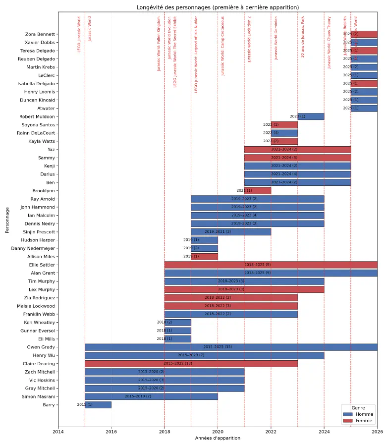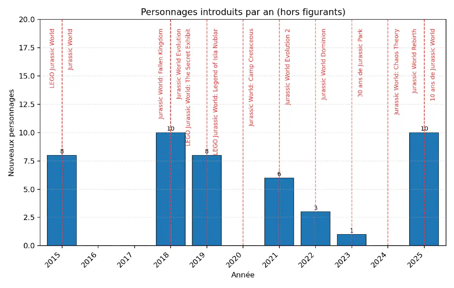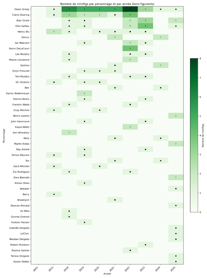 Cette heatmap met en évidence que le règne d’Owen reste concentré entre 2018 et 2023. Il tombe toutefois de son piédestal cette année-là, au profit d’Ellie Sattler, qui se voit offrir 4 minifigs, non sans lien avec l’anniversaire des 30 ans de Jurassic Park.