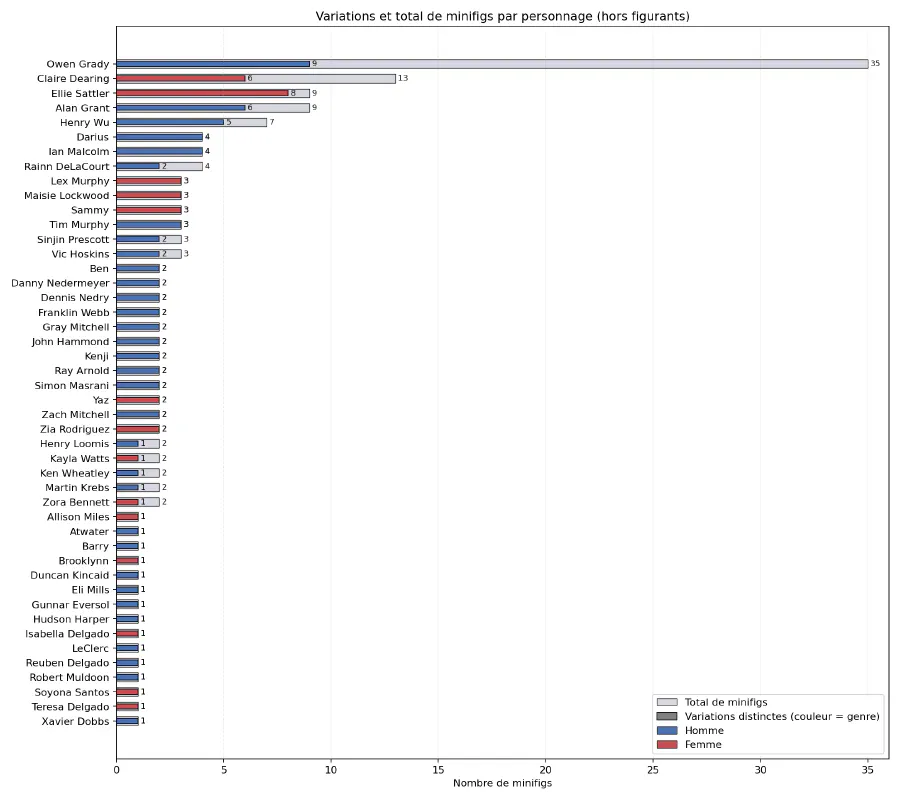 Owen (de Jurassic World) est clairement le personnage le plus représenté, avec 35 minifigs à son image, déclinées en 9 apparences différentes. Il est suivi, de loin, par deux personnages féminins : Claire (également dans Jurassic World) et Ellie (de Jurassic Park). Cette dernière bénéficie d’ailleurs de 8 apparences différences sur ses 9 minifigs.