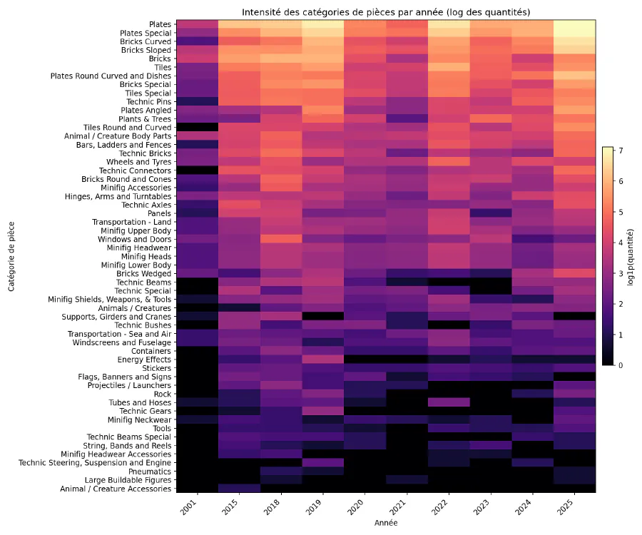 On doit toutefois moduler cette remarque : j’ai constaté au fil du temps que pour rendre le montage de certaines parties complexes et cachées plus facile, LEGO utilise intelligemment les couleurs (par exemple, pour distinguer l’avant et l’arrière, ou la gauche et la droite). Il n’est pas possible, en exploitant uniquement les données du catalogue, de déterminer quelles proportions de pièces sont “structurelles” ou à usage purement esthétique, même en filtrant par catégories de pièces.