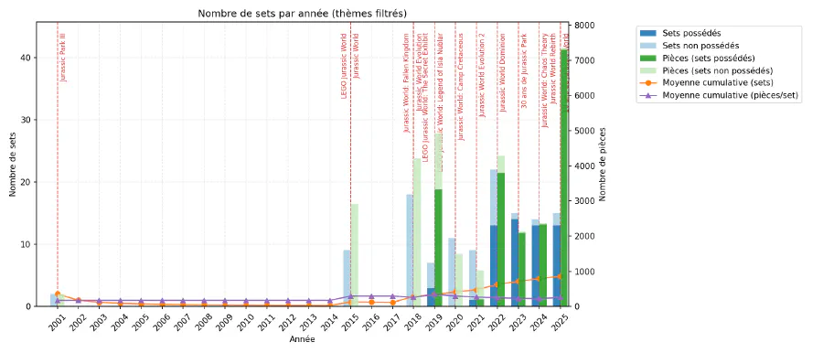Ces premières statistiques m’indiquent que je possède un peu moins de la moitié des sets sortis, mais un peu plus de la moitié des pièces correspondantes : j’ai donc acquis des sets un peu plus gros que la moyenne des sets filtrés. Il faut cependant noter que j’ai commencé ma collection assez tardivement, avec l’immense 75936, Jurassic Park: T. rex Rampage, acquis en 2021, soit 20 ans après le tout premier set consacré à ma saga préférée…
