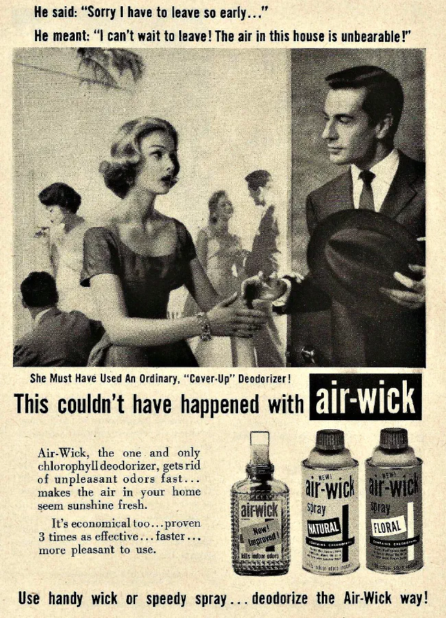 Au XXe siècle, les désodorisants et parfums d’ambiance deviennent des produits de grande consommation grâce à l’aérosol, qui permettra l’usage des désodorisants. Une synthèse grand public de cette industrialisation est proposée par encyclopedia.com. Des formats non pressurisés se généralisent aussi, comme la diffusion par évaporation à partir d’un réservoir et d’une mèche, dont le principe apparaît clairement dans des documents de brevet (par exemple EP0194017A1). Les diffuseurs assistés (ventilation, chauffage contrôlé, électronique) se diversifient ensuite et, là encore, on peut en suivre l’évolution grâce à certains brevets.