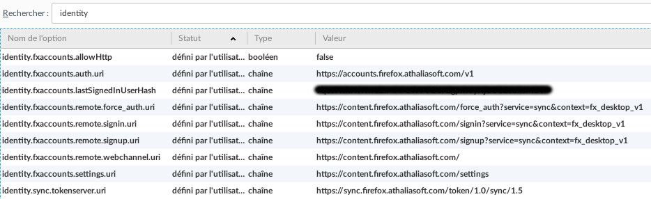 Maintenant que tout est installé, reste à configurer firefox pour prendre en compte notre propre serveur de synchronisation. Fiez-vous à la capture d’écran suivante pour ajuster vos paramètres (dans about:config):