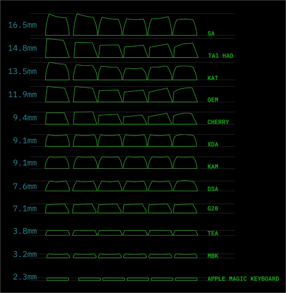 Le profil le plus répandu est l’OEM. Mais c’est le profil Cherry qui est préféré par les typistes parce qu’il permet une frappe plus rapide que sur le profil OEM. Il est difficile de s’en rendre compte simplement en observant la morphologie des touches sur l’image ci-dessus, évidemment, mais c’est manifestement le cas.