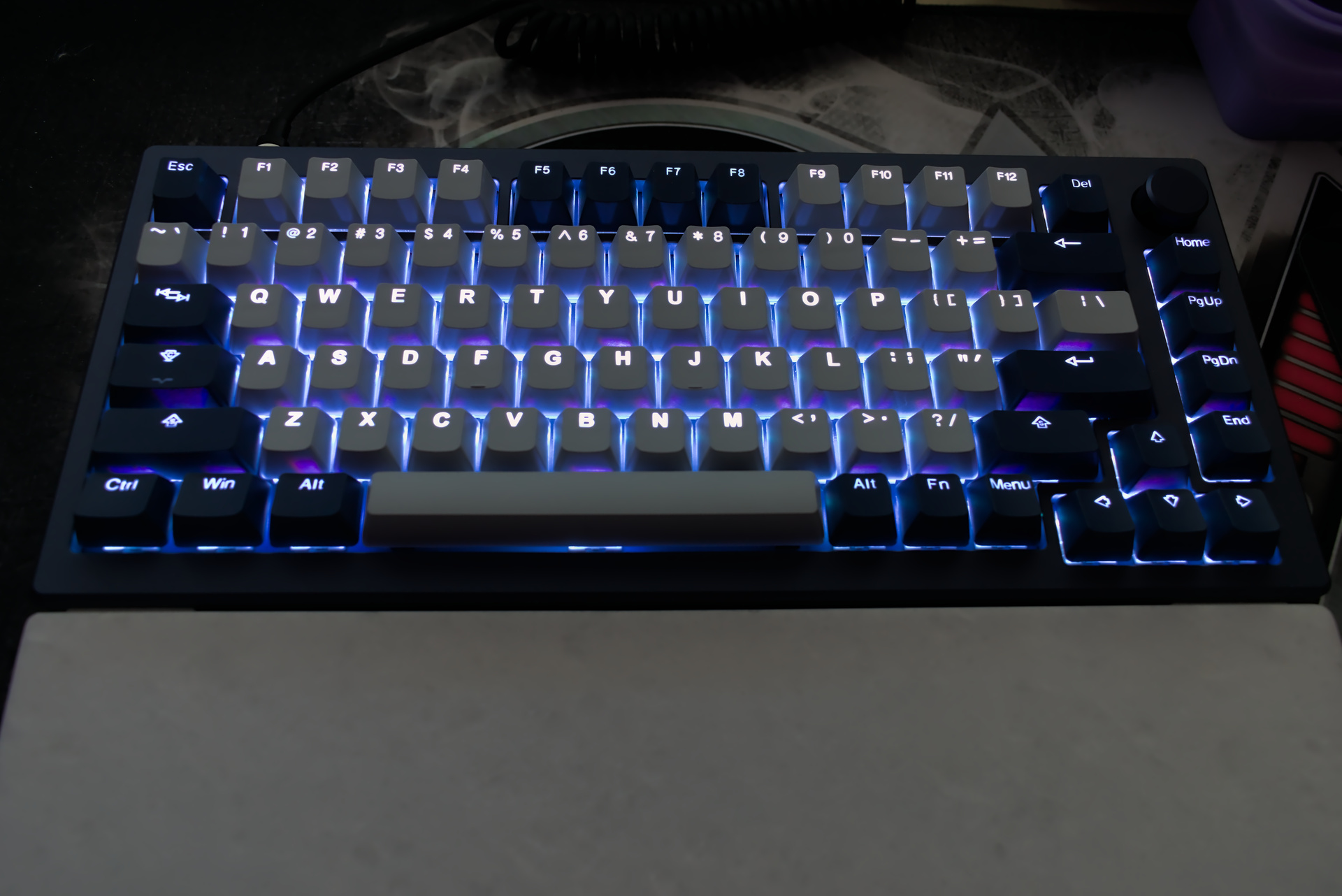 C’est un ensemble composé d’un boîtier en aluminium au format 75% : il est amputé du pavé numérique, et la zone centrale habituelle est réduite à quatre touches disposées à la verticale et des touches fléchées. Une cinquième touche est présente à la droite de la touche F12, et le clavier offre un bouton rotatif permettant de base d’ajuster le volume de la sortie audio de l’ordinateur et la luminosité du rétro-éclairage sur quatre niveaux (plus l’extinction complète). Il offre donc 82 touches.