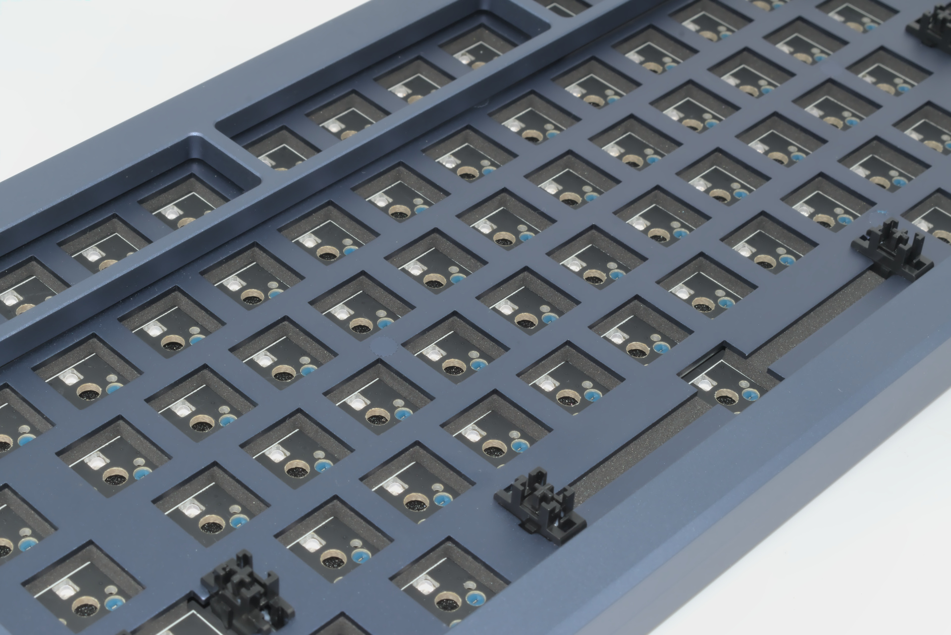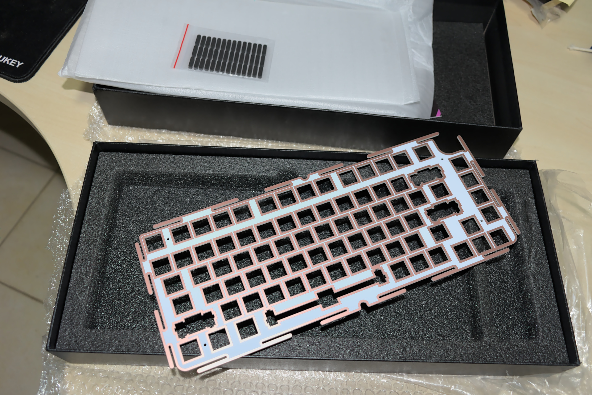Une plaque en aluminium est installée par défaut, mais une plaque en plastique (moins rigide) est également fournie dans le coffret. Une mousse est pré-installée entre le PCB et la plaque, et l’intérieur du clavier est également doté d’une couche de mousse. Il en résulte que l’ensemble du clavier est très rigide, ce qui me convient bien pour le moment, tout en permettant à ceux qui préfèrent un toucher plus souple de supprimer quelques couches simplement en ouvrant le boîtier via les vis hexagonales situées en dessous. Je ne me suis pas encore amusé à l’ouvrir.