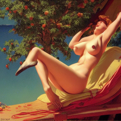 De but en blanc, je suis surpris de retrouver - un peu - l’esprit de Gil Elvgren. Je m’attendais à ce que DiffusionBee soit complètement à côté de la plaque et à être franchement déçu, mais c’est finalement mieux que ce que je craignais. On ne peut évidemment pas croire que c’est bien du Gil Elvgren, on sent clairement que c’est généré par une IA, mais c’est pas trop mal.