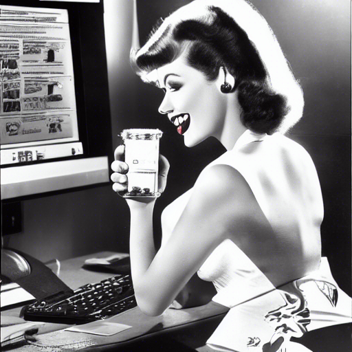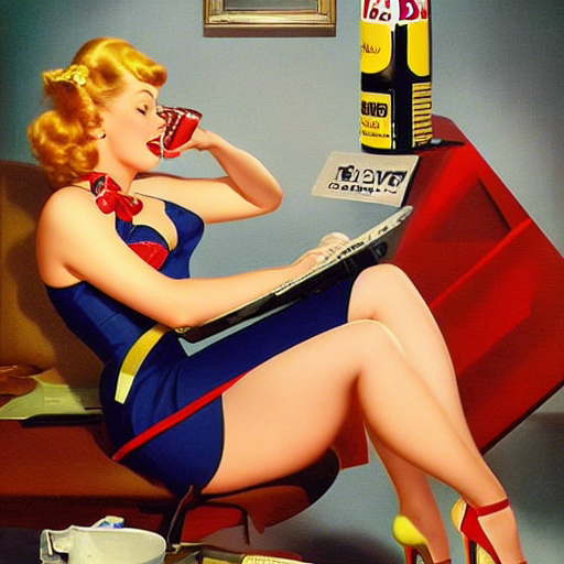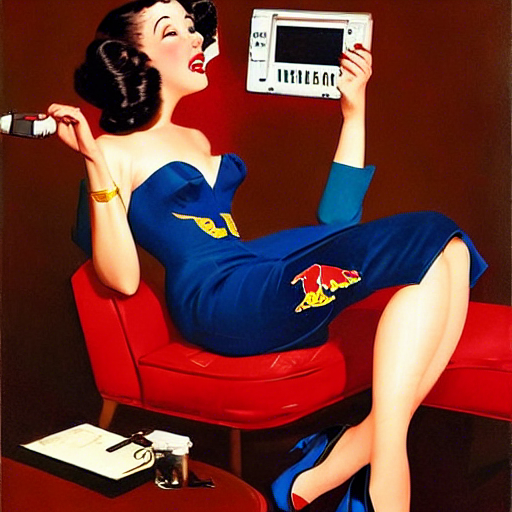 pin-up drinking a Red Bull while playing computer, art by Gil Elvgren