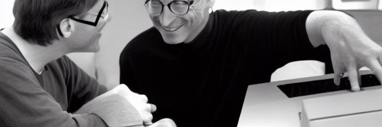 Pas de PC sous Linux et les visages semblent être mélangés. C’est à la fois étrange et fun de voir ça… Une façon d’éviter les deep-fake ? La différenciation entre les deux protagonistes se fait essentiellement par leur taille et leur garde-robe : on identifierait aisément Gates et Jobs en masquant leur visage sur cette “photo”.