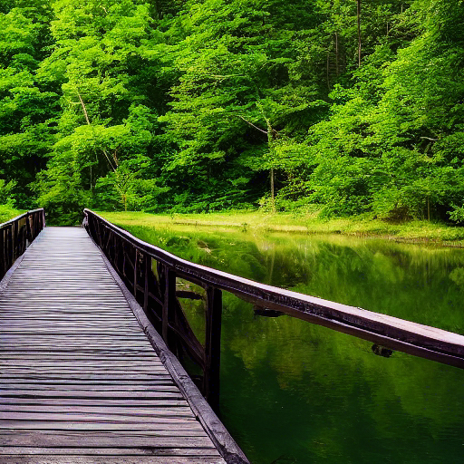 a wooden bridge crossing a quiet river in the middle of a meadow