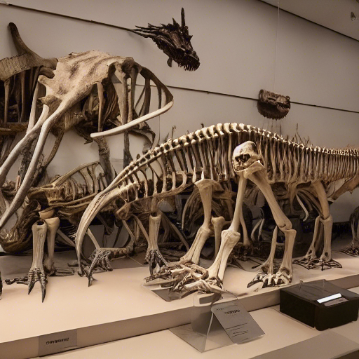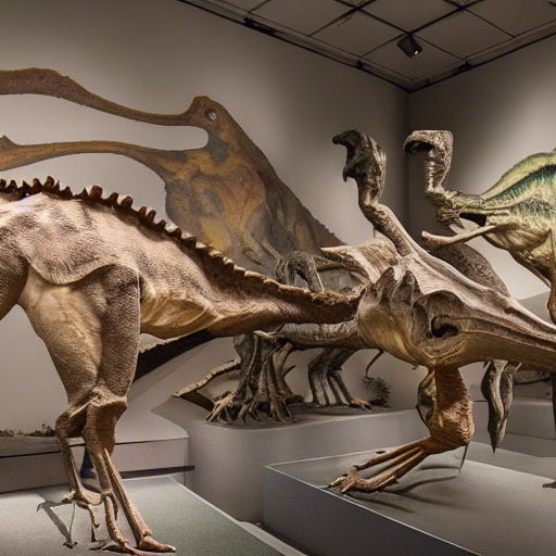 photorealistic collection of dinosaurs skeletons in a museum