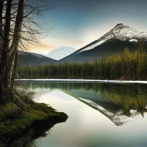 photorealistic landscape with a mirror lake, lush forest and ice-caped mountain