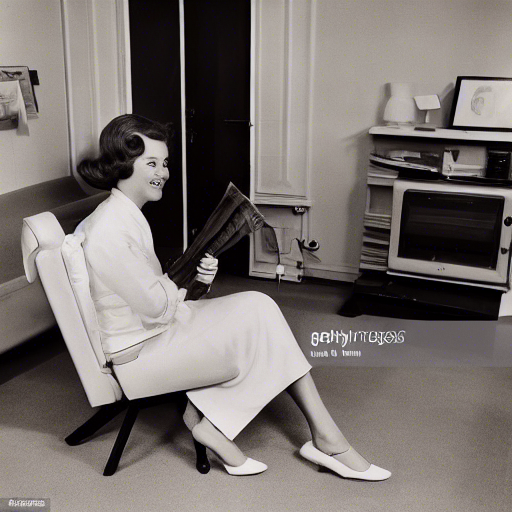 Je me demande ensuite ce que je peux obtenir en augmentant les détails de ma requête (et donc la complexité de l’image). J’ai en tête une image assez précise que j’ai probablement déjà vu dans ma vie dans un magasine, une publicité ou autre, sans pour autant être capable de la retrouver. Je vais voir ce que DiffusionBee peut faire pour moi. L’occasion également de tester un peu le modèle : le prompt que j’ai utilisé cherche volontairement à dépeindre une scène traditionnelle des années 60, mais qui est aujourd’hui considérée comme sexiste.