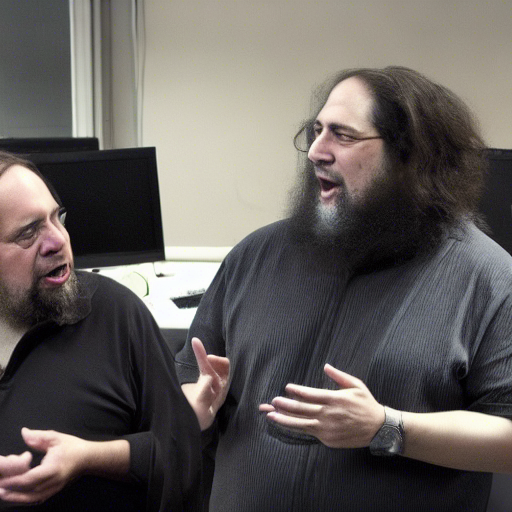 Intéressant, très intéressant. Il semble que le modèle ait été entraîné avec une certaine photo de Torvalds levant le majeur… Bon alors par contre, pas évident de dire qui est qui. Les deux protagonistes portent une grosse barbe (ce qui n’est pas le cas de Torvalds). Je ne vois pas de ressemblance avec l’un ni avec l’autre. Juste deux geeks en pleine querelle de chapelle.