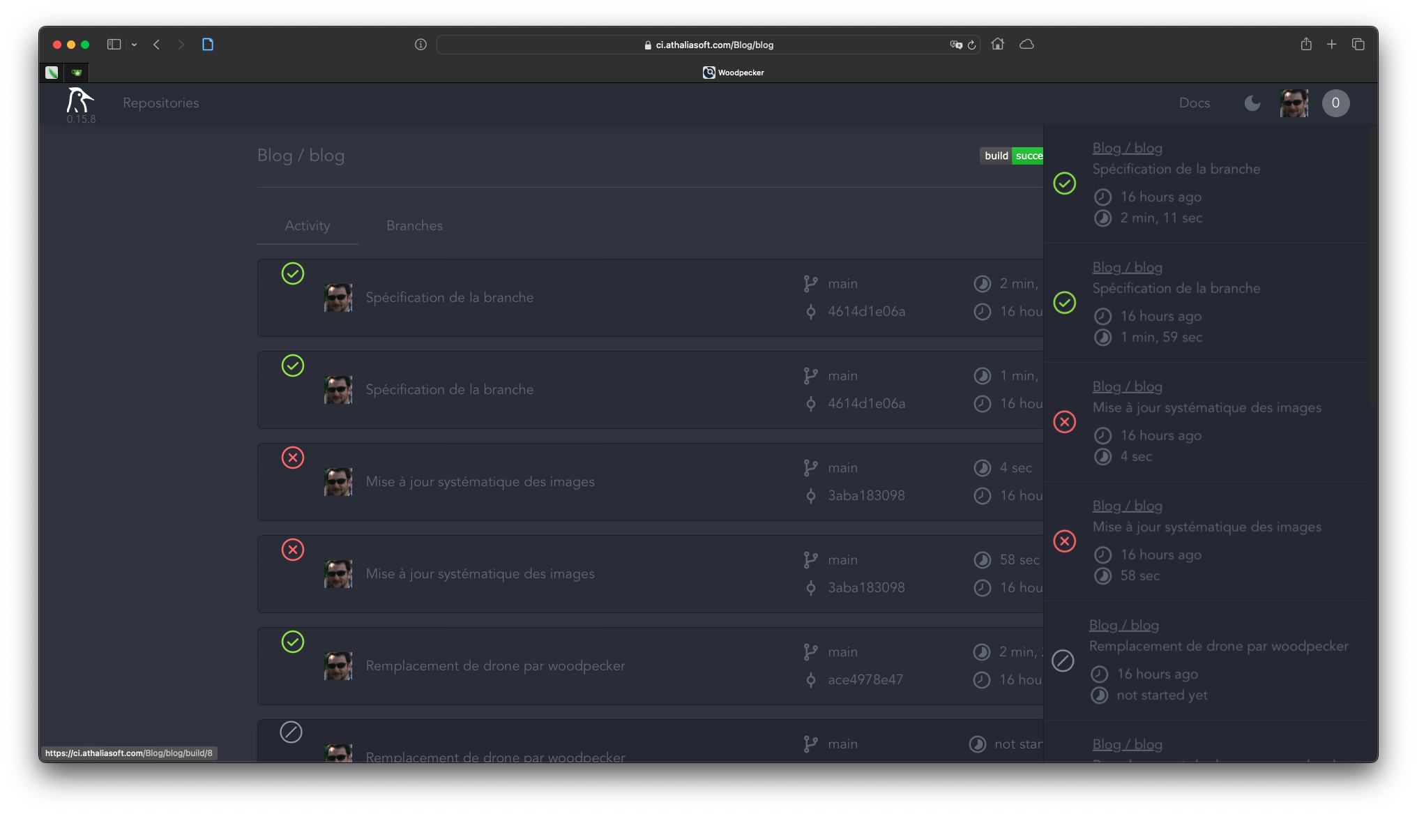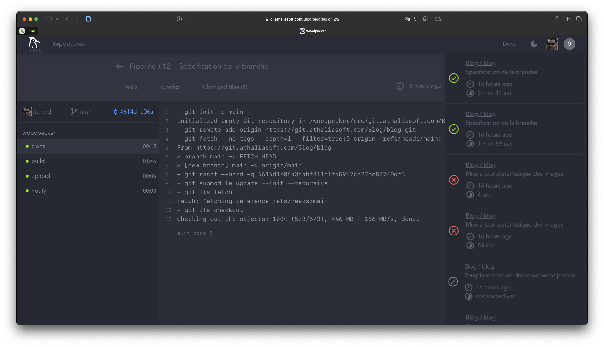 C’est une critique dure que je fais ici, parce qu’en fin de compte les changements devraient être mineurs, et surtout, les pipelines de Woodpecker semblent moins “verbeuses” que celle de Drone, en tout cas pour le moment. La structure du yaml est un peu simplifiée, et la simplification est - presque - toujours bienvenue.