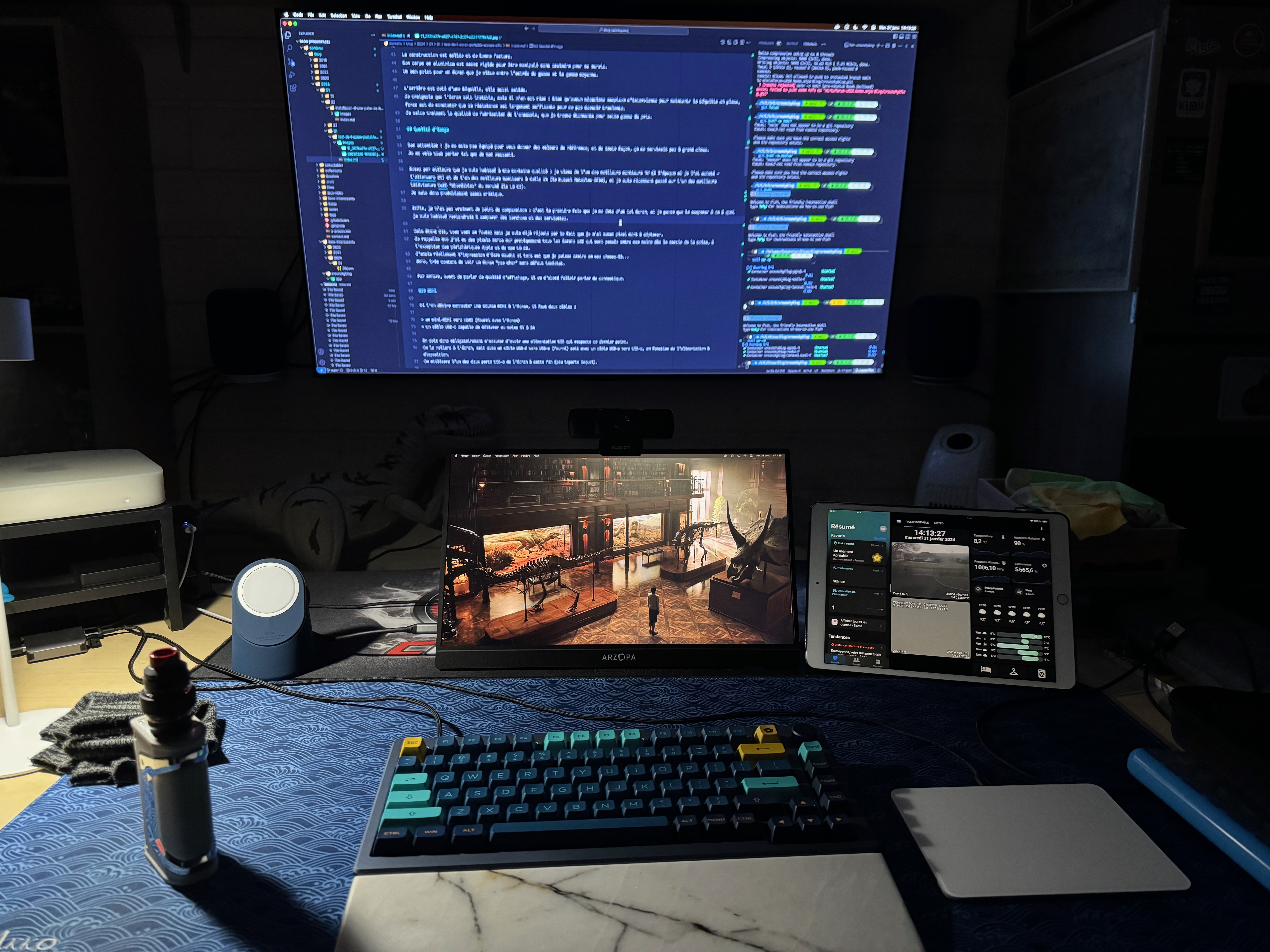 L’écran de 16 pouces au centre. L’iPad Pro à droite est un 10.5 pouces, le LG C3 de 55 pouces en arrière-plan. L’encombrement de l’Arzopa est vraiment réduit mais m’offre tout l’espace visuel qui me manquait !