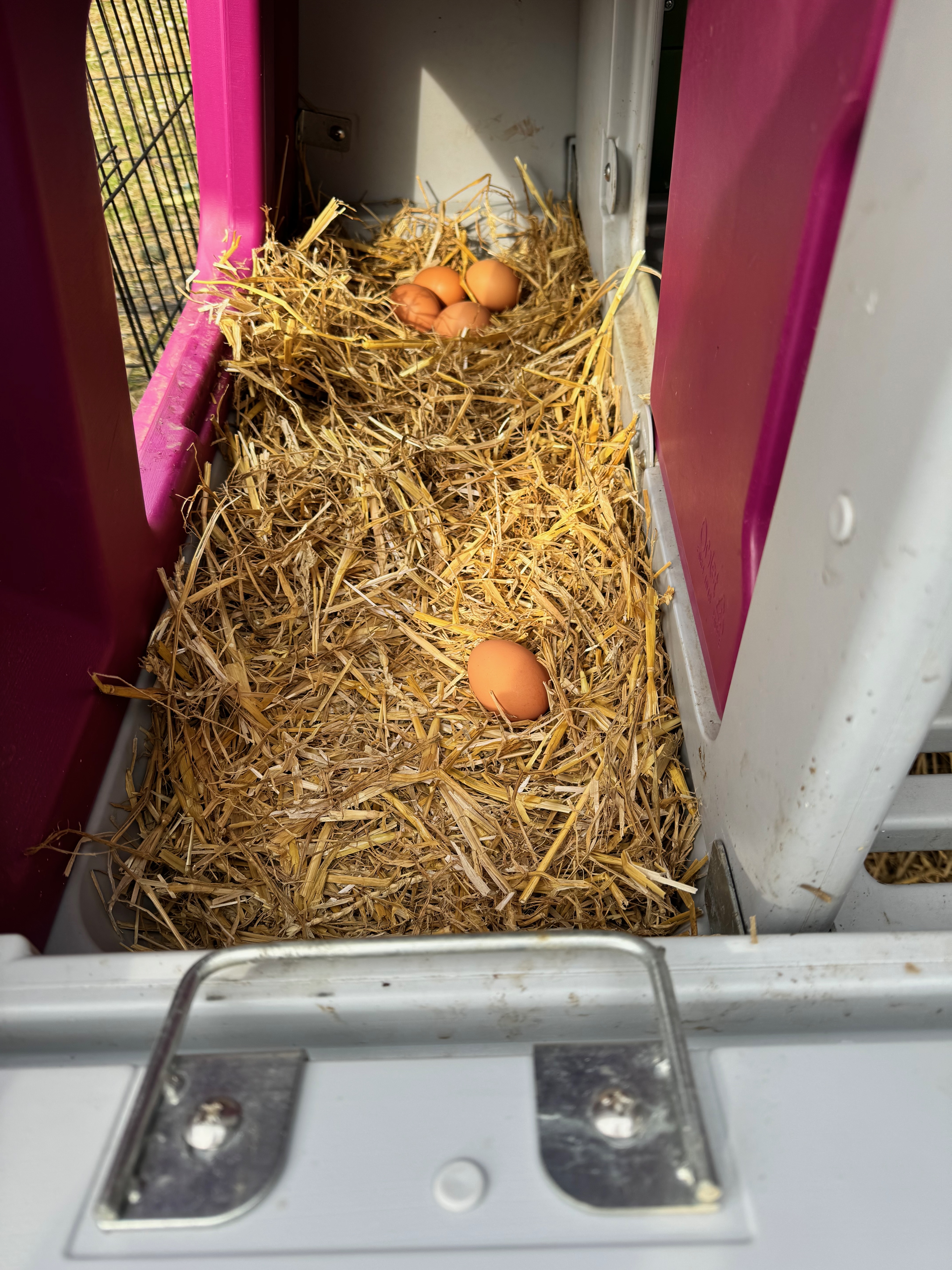 Le pondoir nécessite moins d’entretien parce qu’en théorie, les poules n’y vont que pour pondre. Si l’on prend l’habitude de fermer la cloison pour la nuit, il est possible de le nettoyer une fois par mois. On y mettra de la paille ou toute litière appropriée, de sorte à ce que les poulettes puissent former un ou plusieurs nids dans lesquels elles iront pondre instinctivement. Je précise qu’on n’a jamais eu besoin de leur apprendre à pondre ici : ça s’est fait naturellement !