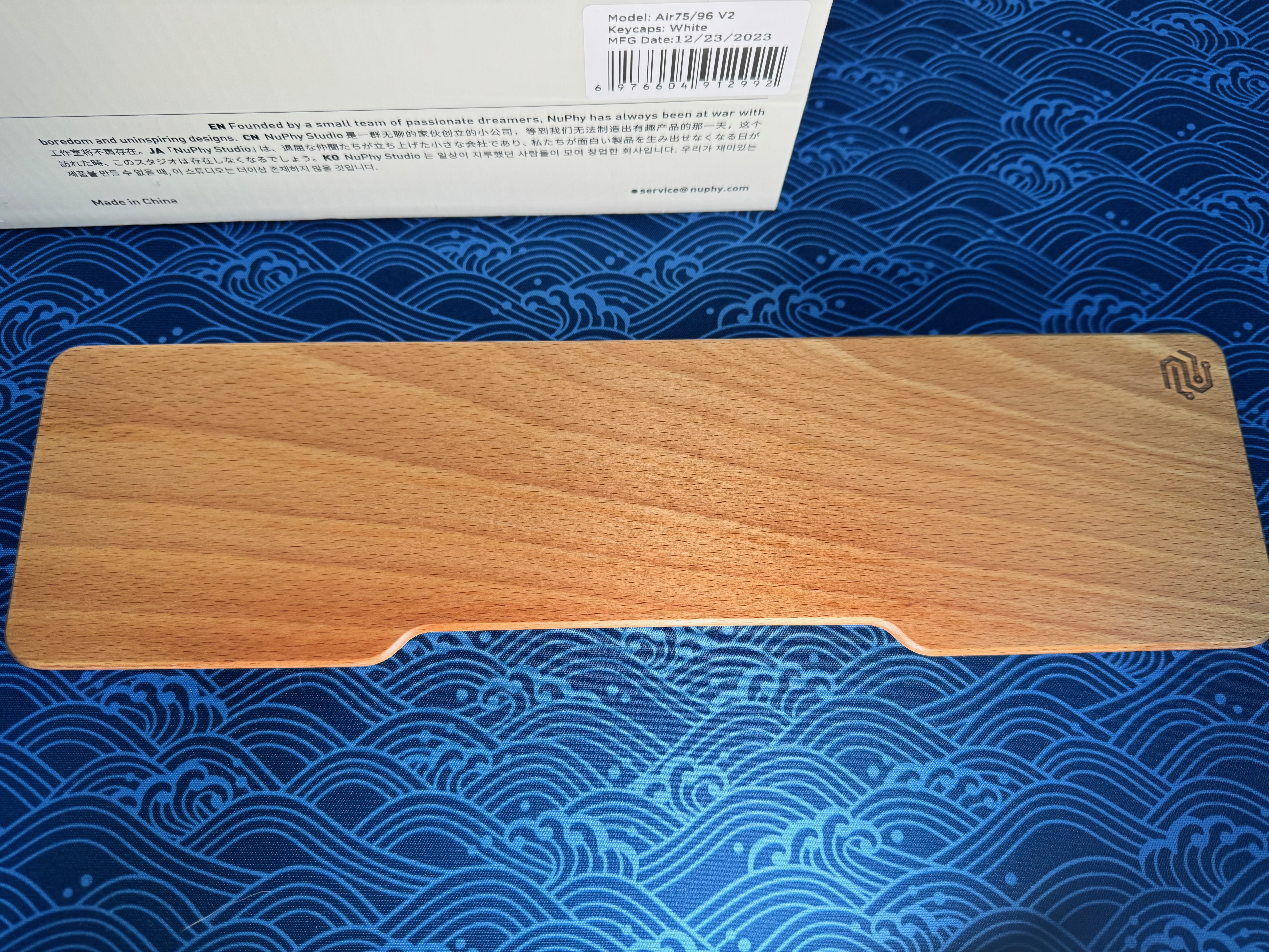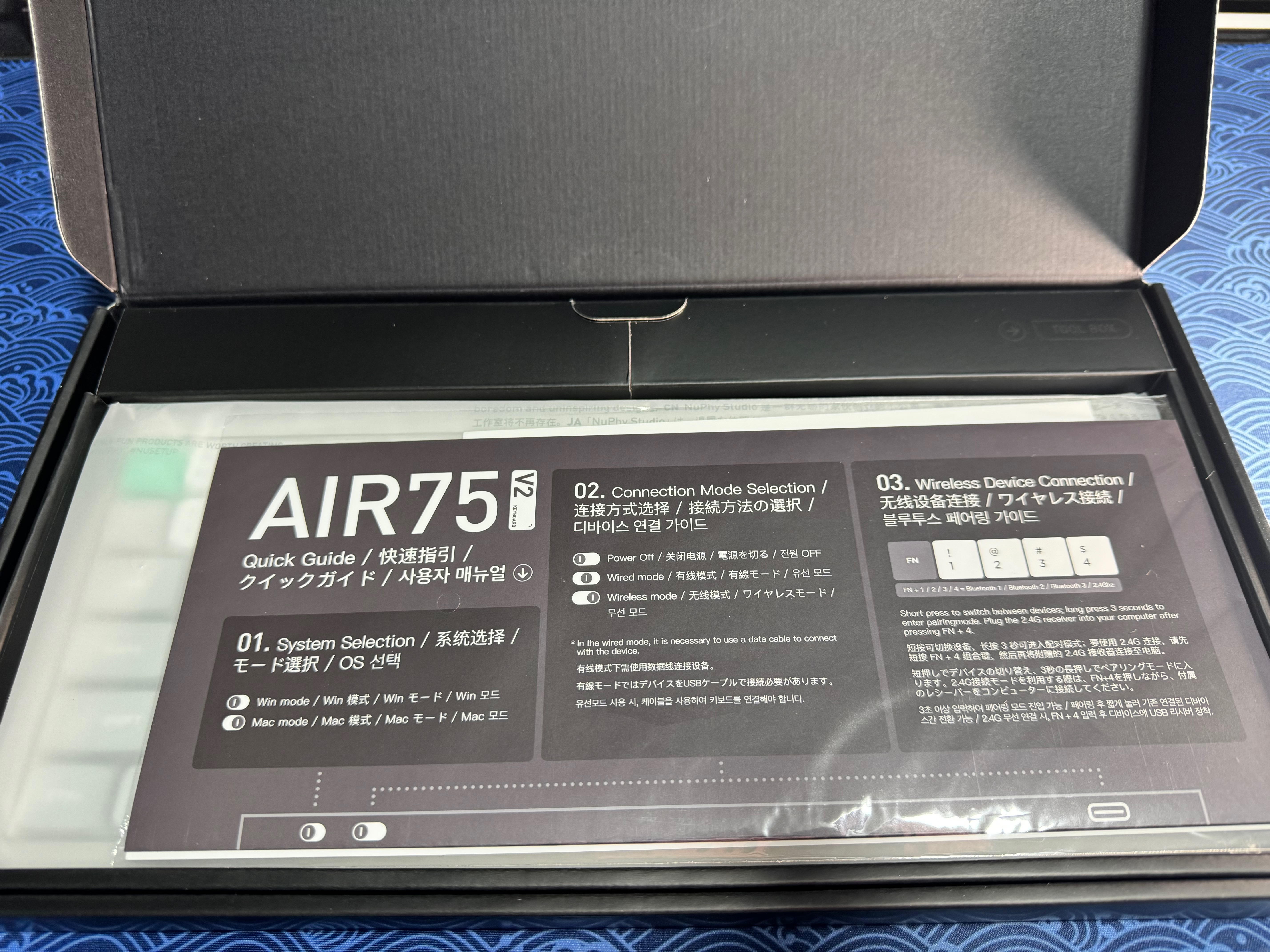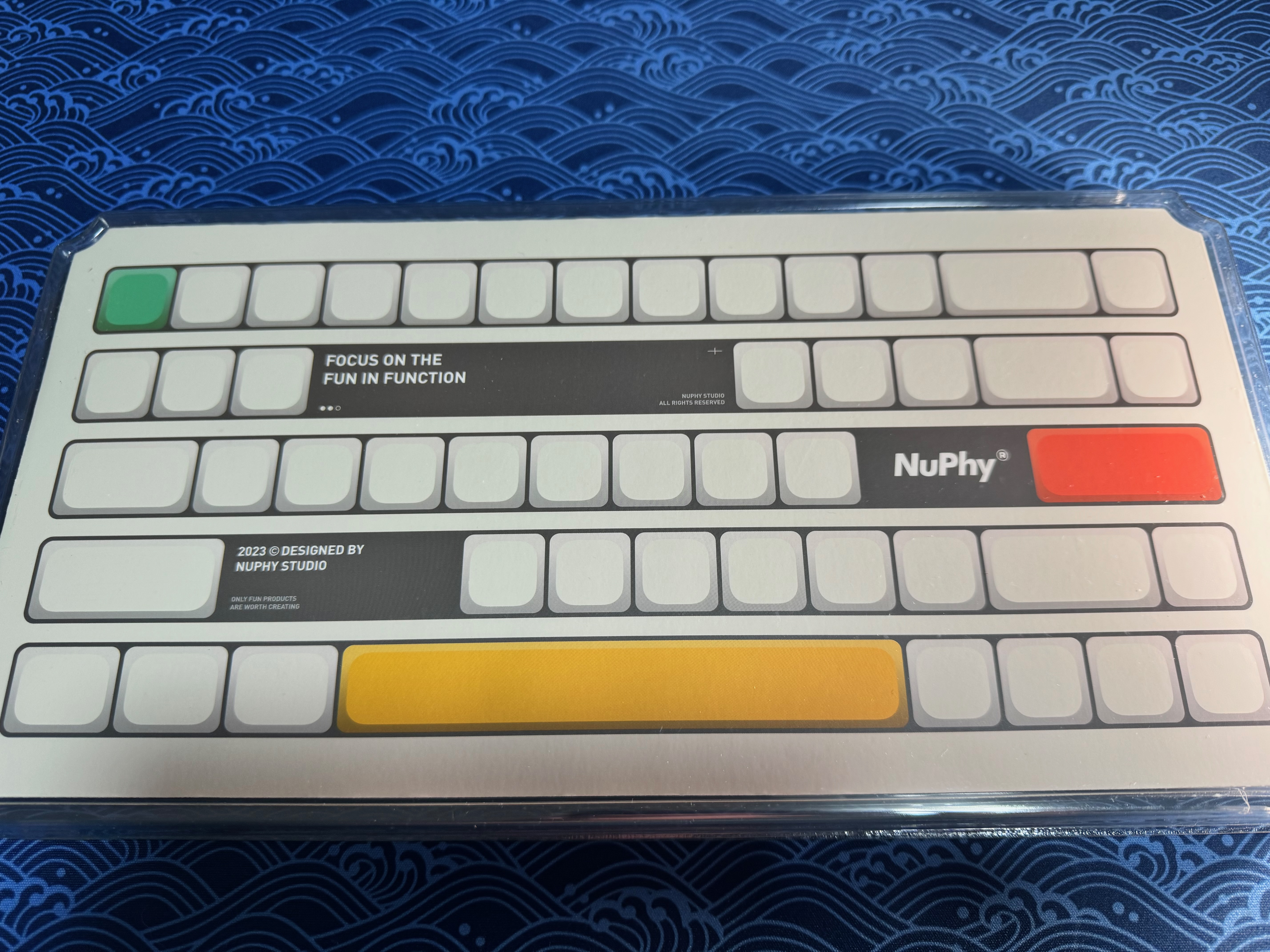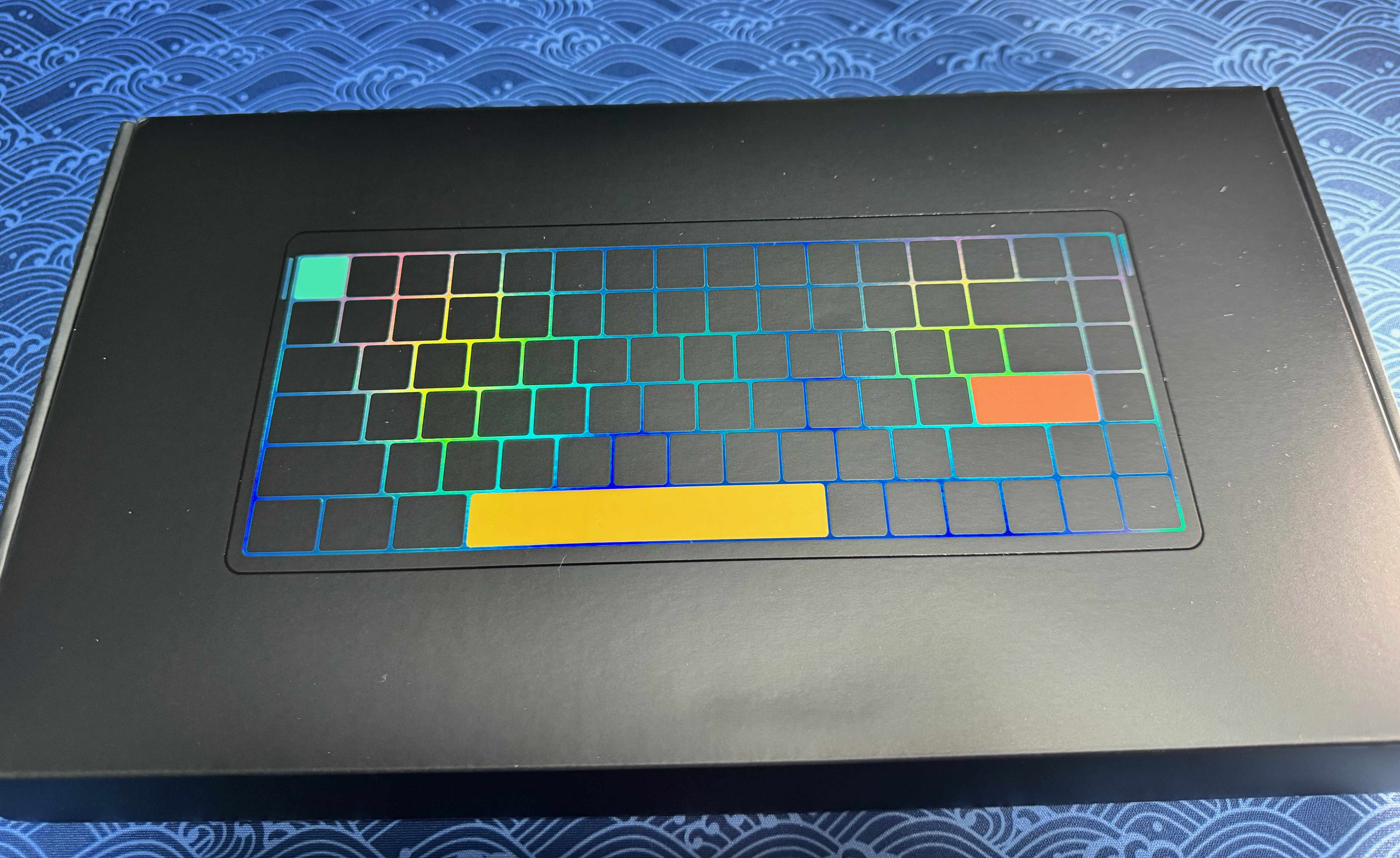 Extérieur du packaging du clavier. On notera que les couleurs changent avec l’orientation pour un rendu réel beaucoup plus sobre et classieux