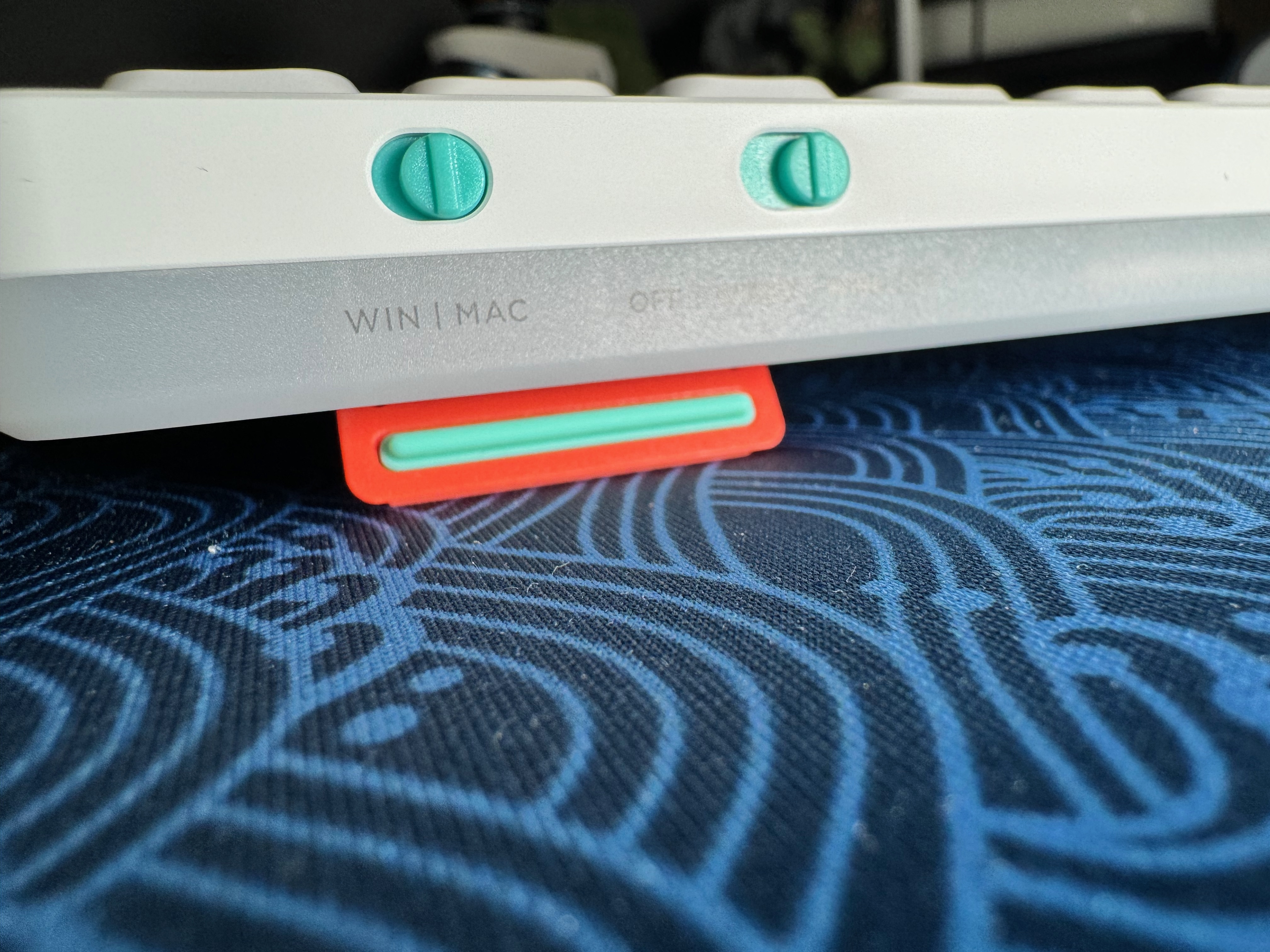 Jongler avec le Akko entre mon Mac mini et mon PC de jeu est un peu pénible puisque je dois avoir recours à un switch USB qui me permet de basculer d’une machine à l’autre. Avec une triple connexion, je peux passer d’une machine à l’autre avec un petit interrupteur sur le côté du clavier (Feker le disposait sur le dessous et ça me faisait pester). Je note en tout cas la qualité supérieure de cet interrupteur, comparativement à celui du Feker.