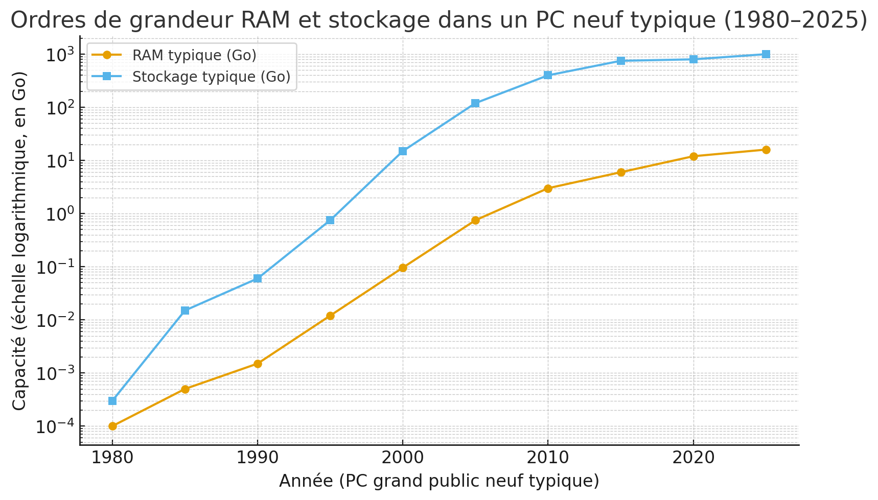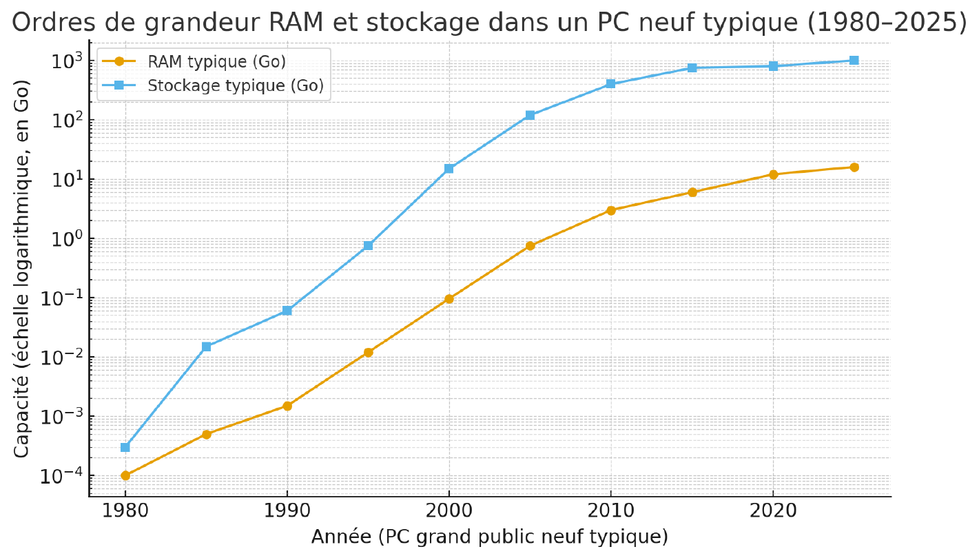 | 2025 | ≈ 16 Go (8 Go bas de gamme) | ≈ 1 To (SSD 512 Go–1 To sur la plupart des portables) |